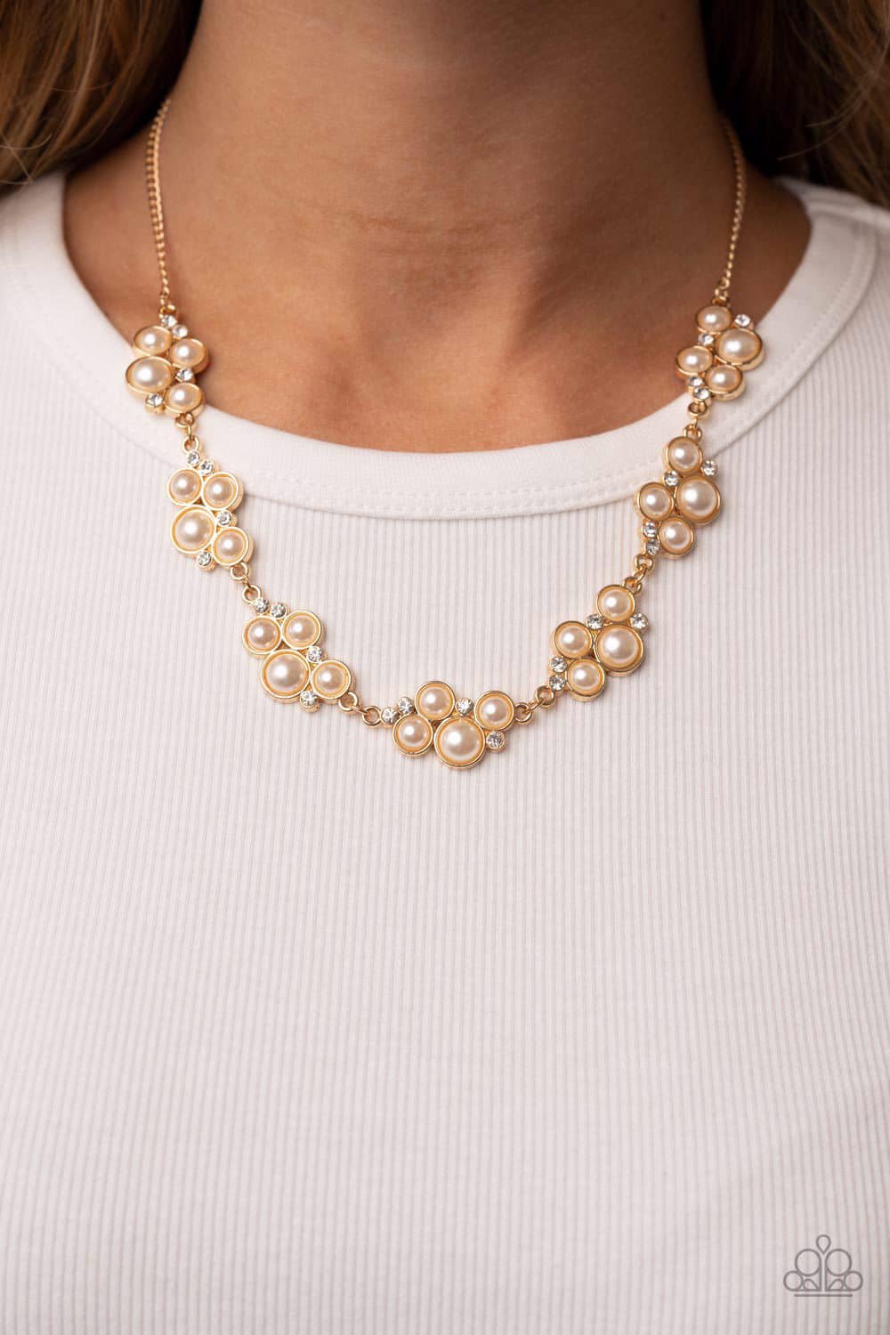 Bubbly clusters of dainty white rhinestones and white pearls delicately links below the collar, resulting in a timeless golden centerpiece. Features an adjustable clasp closure.