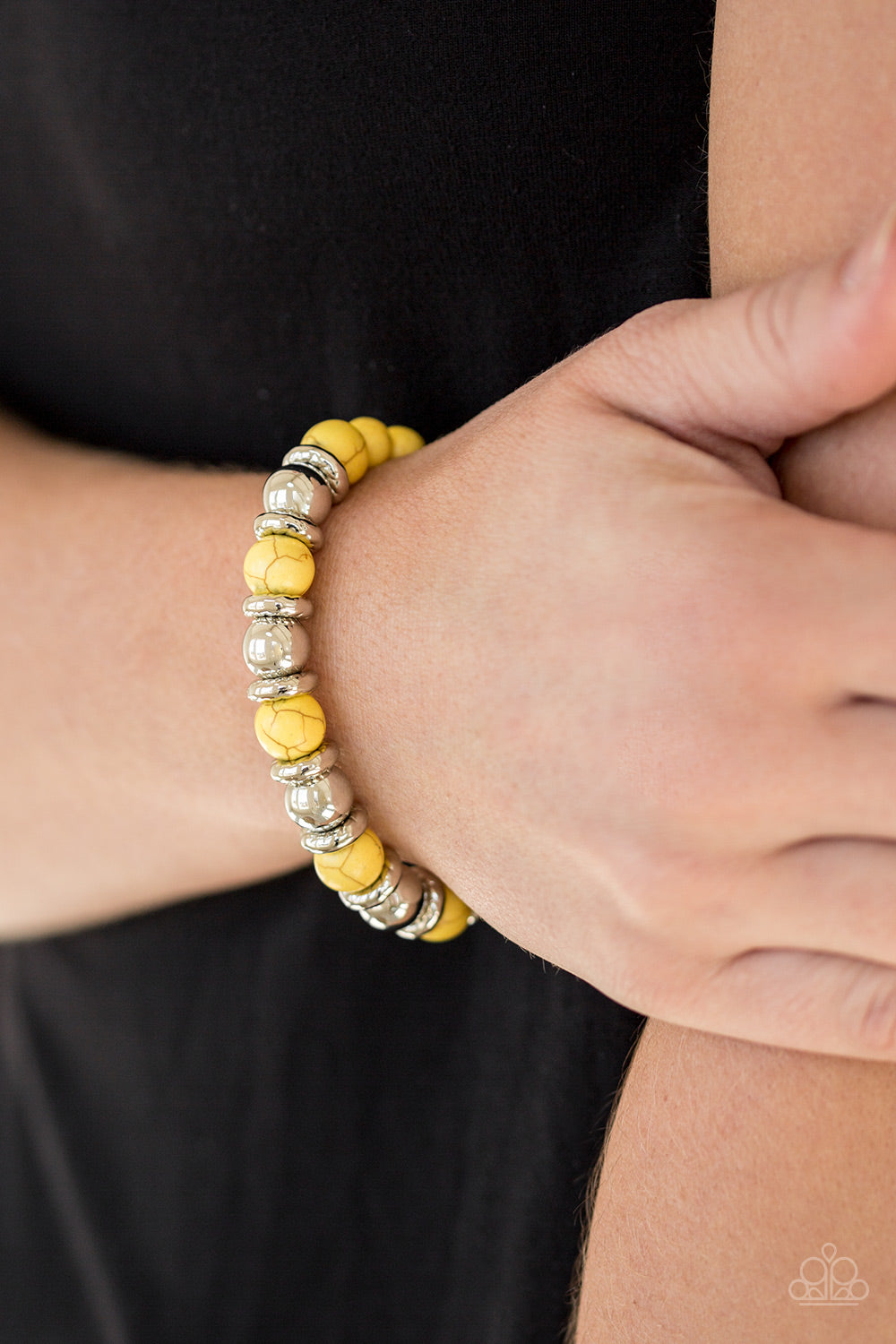 A collection of silver accents and sunny yellow stones are threaded along a stretchy band for a seasonal look.