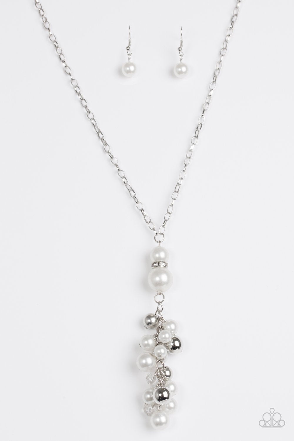 Infused with a rhinestone encrusted ring, a bubbly white pearl pendant swings from the bottom of a shimmery silver chain. White crystal-like, shiny silver, and classic white pearls cascade from the bottom of the pendant, creating a refined tassel. Features an adjustable clasp closure. Sold as one individual necklace. Includes one pair of matching earrings.