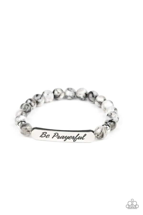 Infused with dainty silver accents, a collection of glassy black and white stone beads and a shimmery silver frame stamped in the phrase, "Be Prayerful", are threaded along a stretchy band around the wrist for an inspirational look. Color may vary. Sold as one individual bracelet.