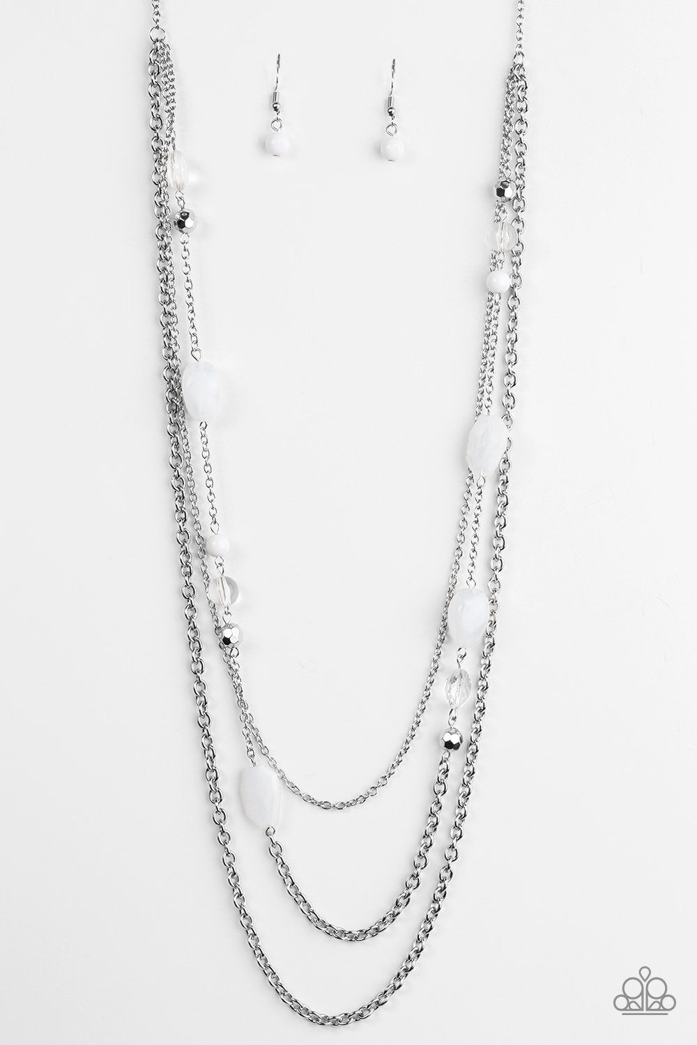 Varying in shape and shimmer, white beads trickle along a shimmery silver chain for a neutral look. Infused with faceted silver beads, the neutral strands alternate across the chest with shiny silver chains, creating whimsical layers. Features an adjustable clasp closure.