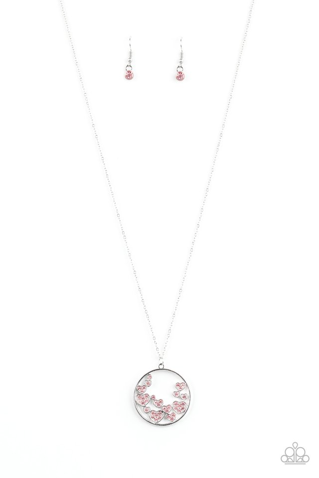 Pink rhinestones are sprinkled across a round silver pendant radiating with dainty silver hearts for a romantic finish. Features an adjustable clasp closure.