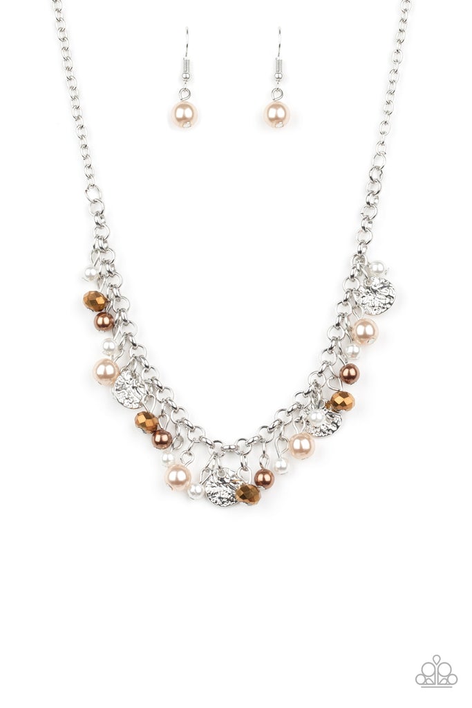Pearly white and brown beads, aurum crystal-like gems, and hammered silver discs swing from a bold silver chain, creating a refined fringe below the collar. Features an adjustable clasp closure.