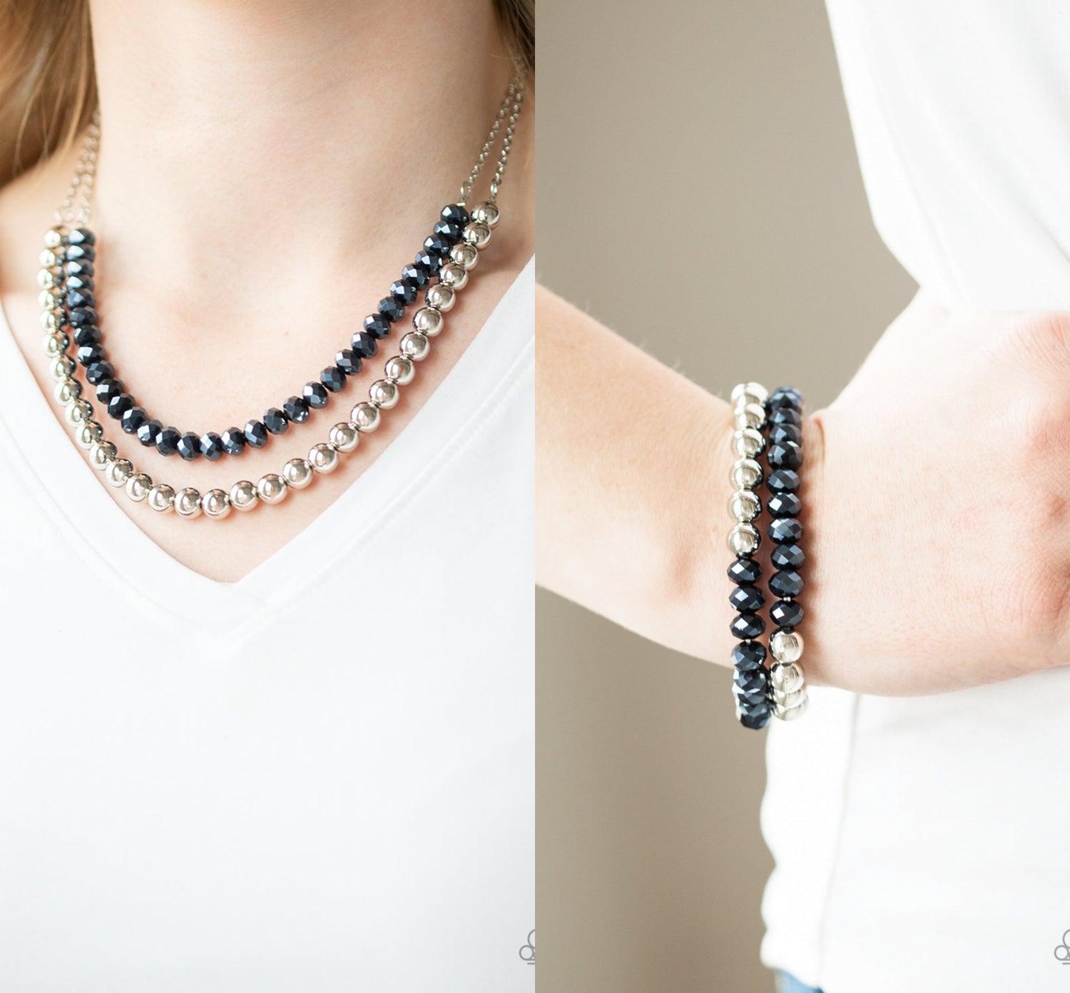 Dipped in a metallic shimmer, a strand of glittery blue crystal-like beads gives way to a strand of shiny silver beads below the collar for a colorfully layered look. Features an adjustable clasp closure.