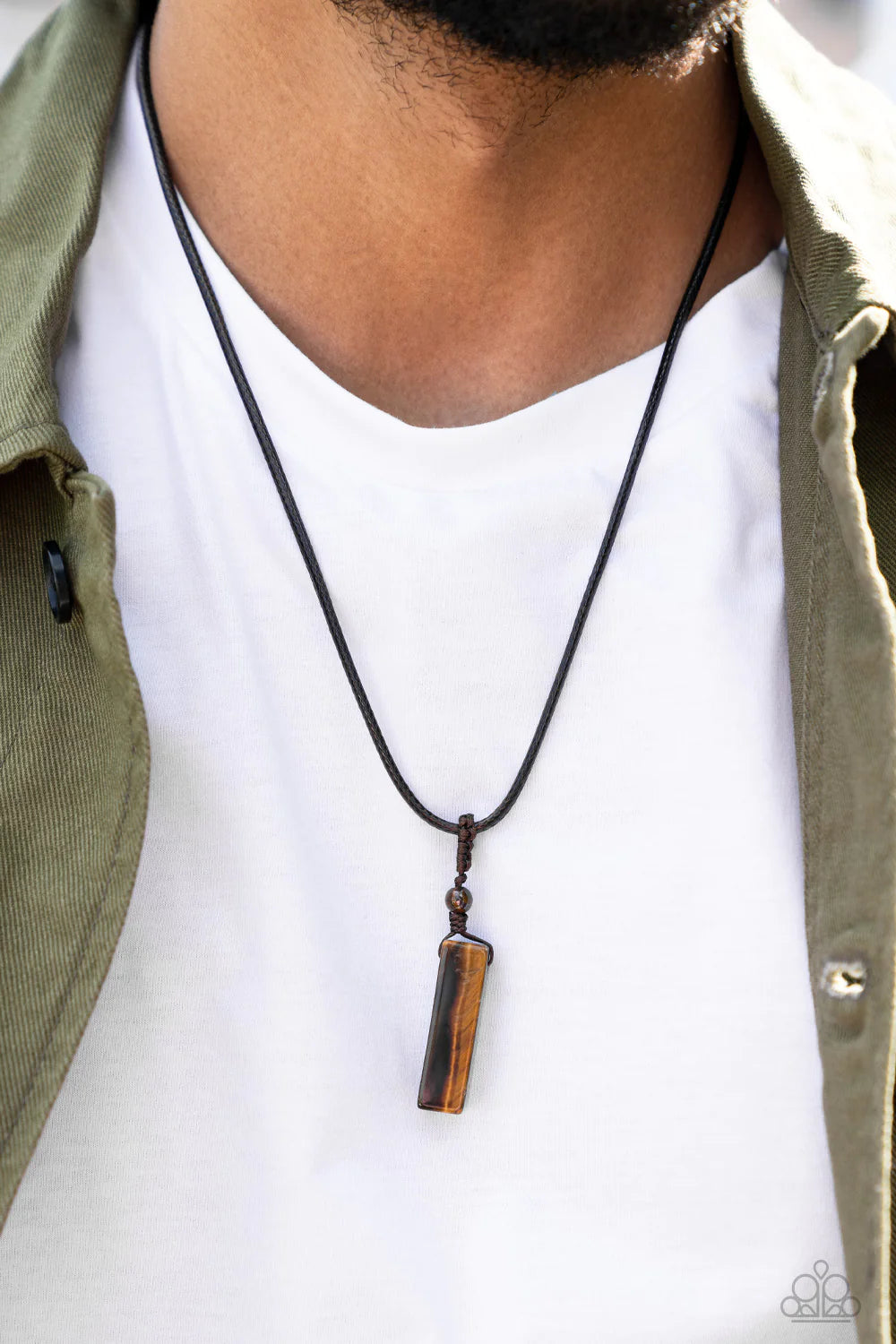 A rectangular tiger's eye stone pendulum is knotted in place below a dainty tiger's eye stone bead that glides along a shiny brown cord below the collar, resulting in an earthy pendant. Features an adjustable sliding knot closure.