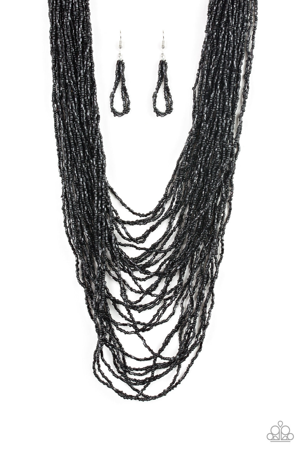 Brushed in an icy metallic shimmer, countless strands of black seed beads drape across the chest in a bold fashion. Featuring a collision of shapes and shimmer, the glittery strands connect to two large silver accents for a flashy finish. Features an adjustable clasp closure.