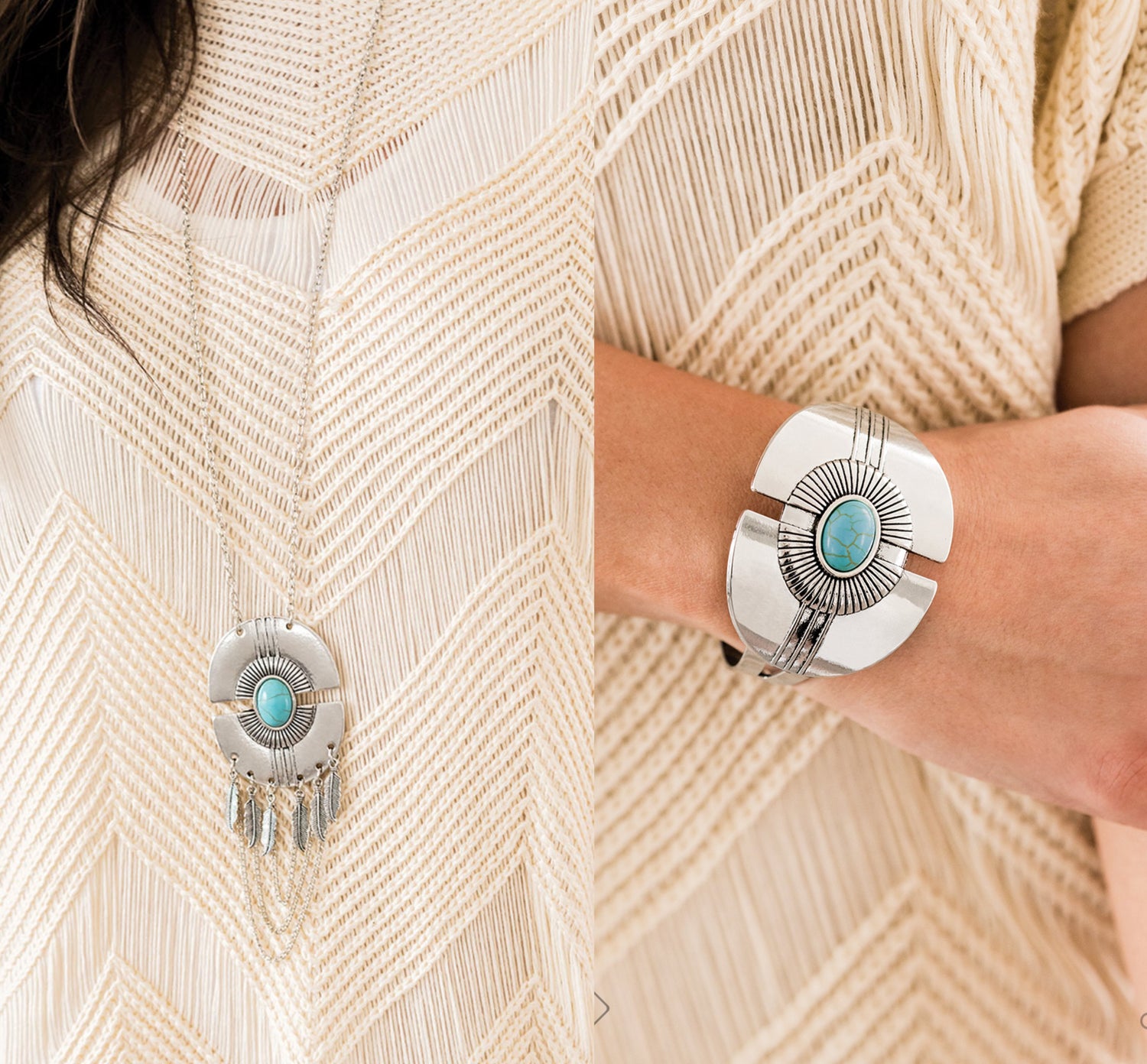 A fringe of antiqued silver feathers and shimmery silver chains dangle from the bottom of a stacked silver frame fanning with striking texture. A smooth turquoise stone dots the tribal inspired pendant for an earthy finish. Features an adjustable clasp closure.