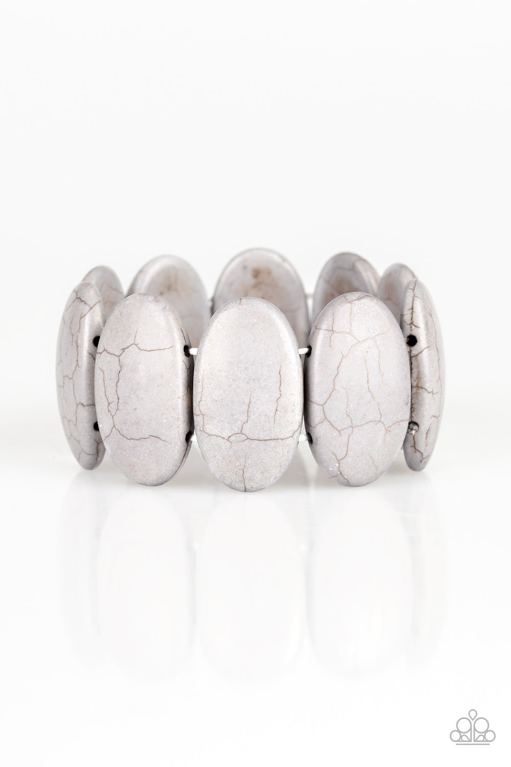 Chiseled into smooth ovals, earthy gray stones are threaded along stretchy elastic bands around the wrist for an artisan inspired look.