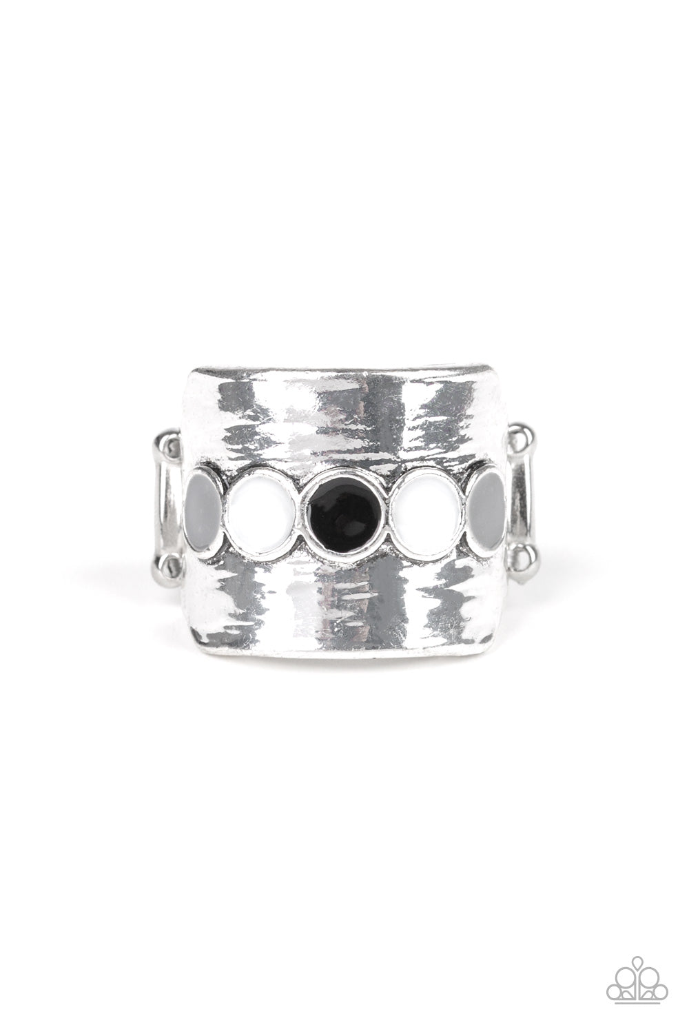 Painted in black, gray, and shiny white finishes, round frames dot the center of a thick silver band for a colorful tribal look. Features a stretchy band for a flexible fit.