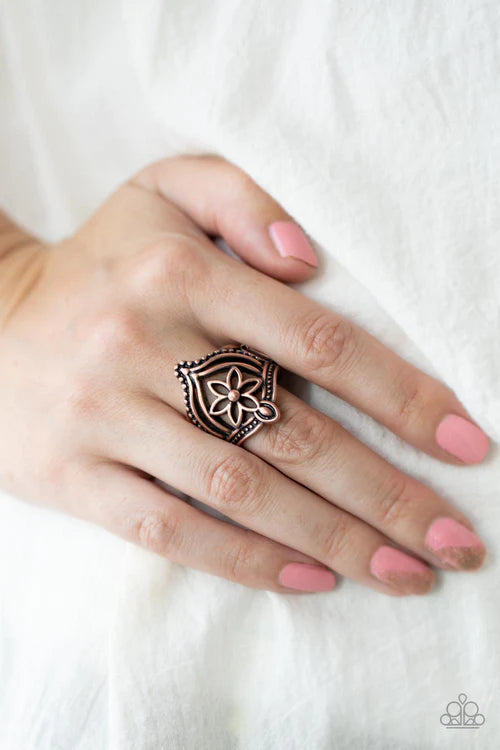 Studded and smooth copper bars arc atop a silver floral center, creating an eastern inspired motif atop the finger. Features a stretchy band for a flexible fit.