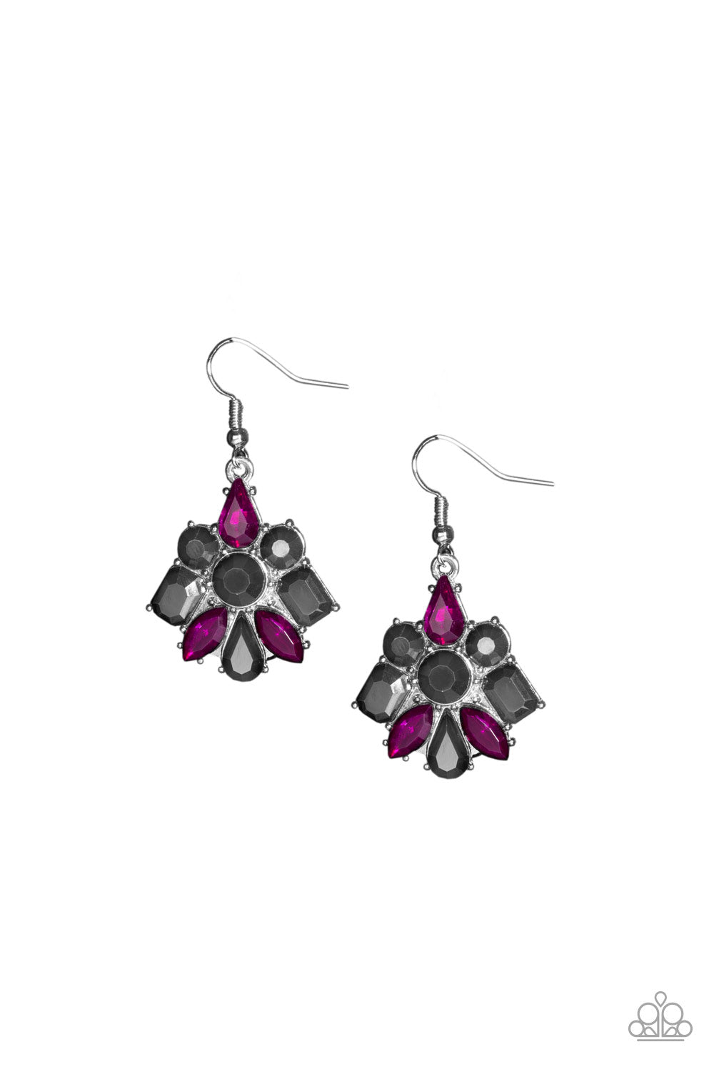 Varying in cut and shimmer, glittery pink and hematite rhinestones coalesce into a blinding lure for a dramatic look. Earring attaches to a standard fishhook fitting.