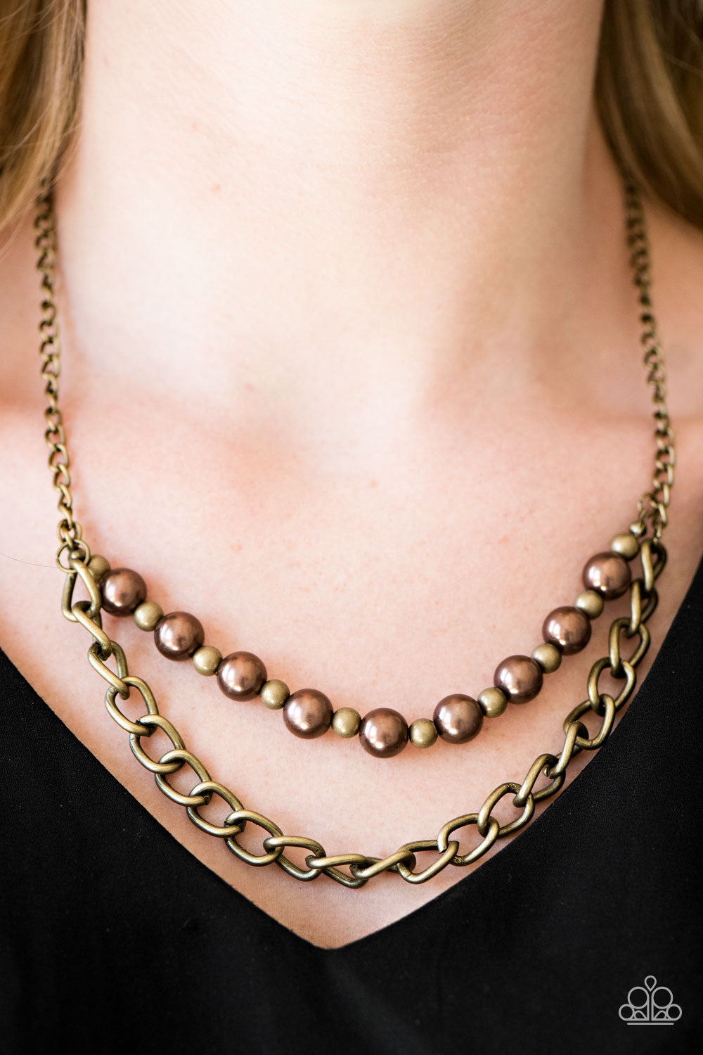Pearly brown and rustic brass beads are threaded along a skinny wire. The pearly beading gives way to a bold strand of brass chain, creating edgy layers below the collar. Features an adjustable clasp closure.