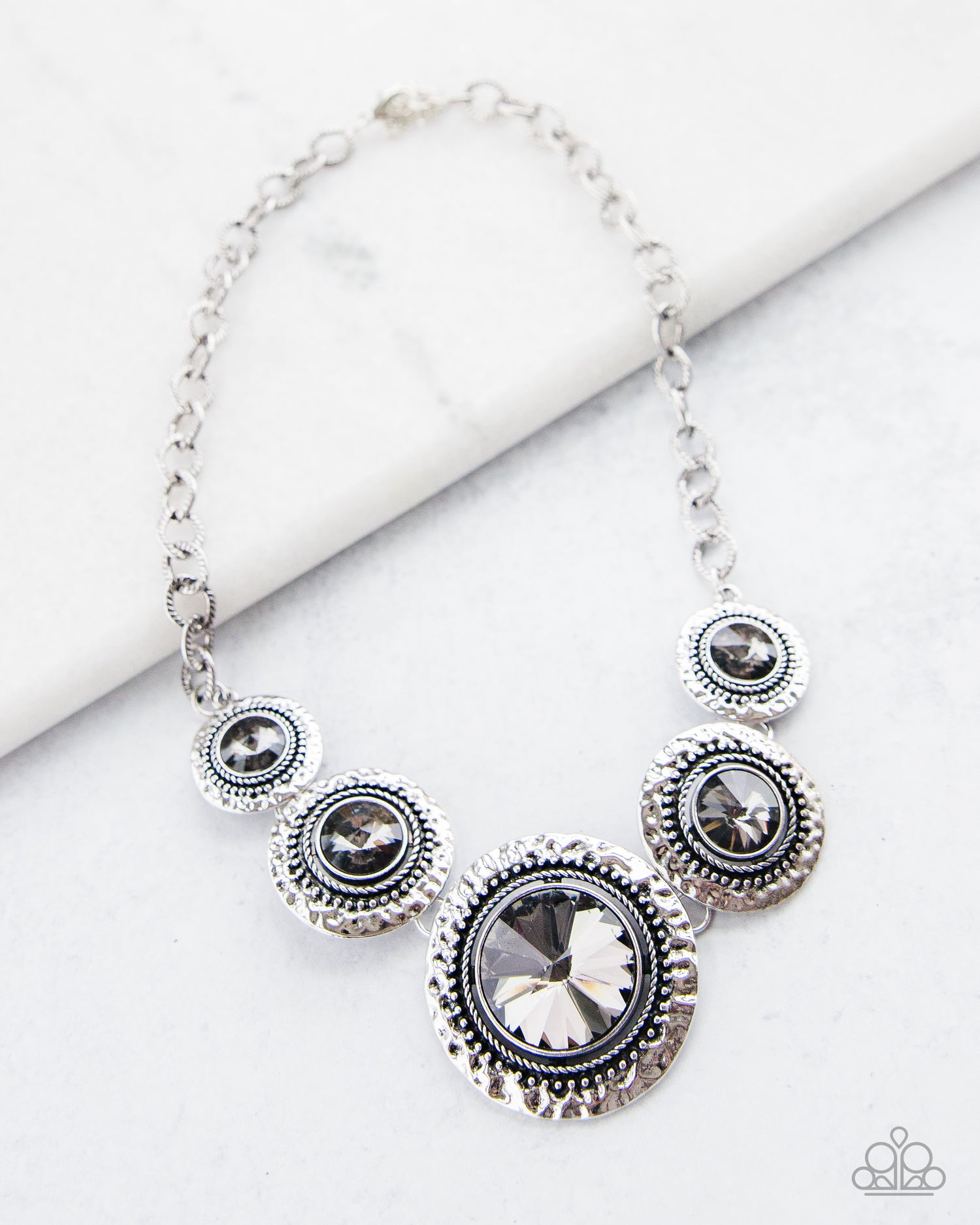 Gradually increasing in size, dramatically oversized smoky gems are pressed into the centers of hammered and silver studded frames. The blinding frames link below the collar for a glamorous, statement-making finish. Features an adjustable clasp closure.