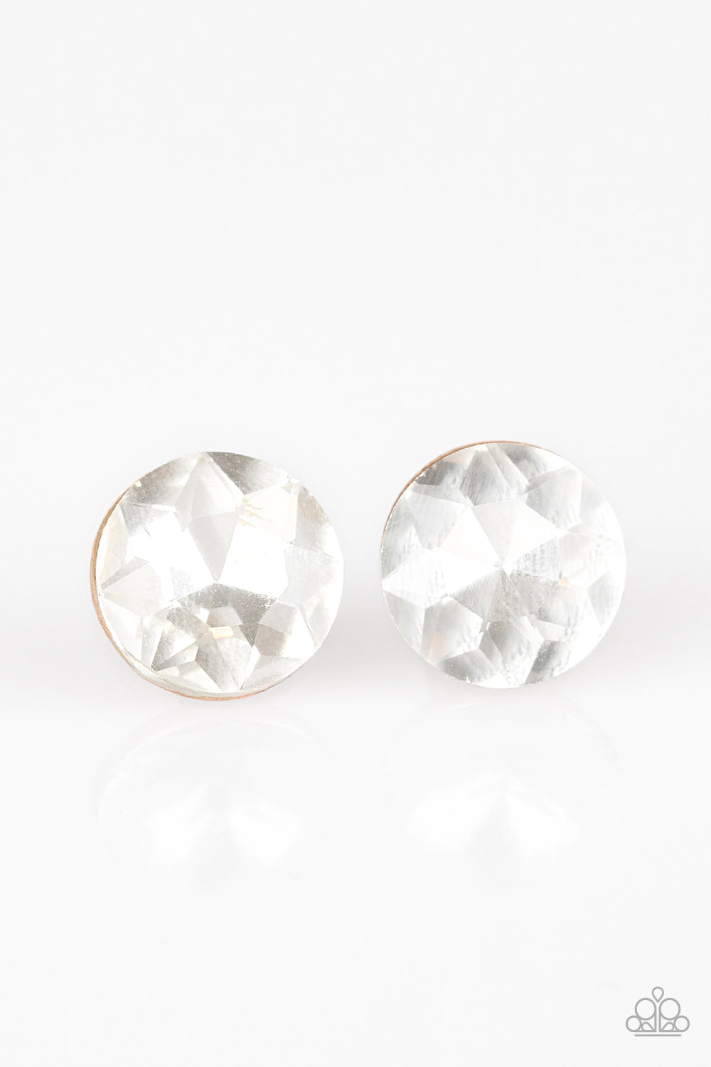 A sparkling white rhinestone is nestled inside a round gold frame for a timeless look. Earring attaches to a standard post fitting.