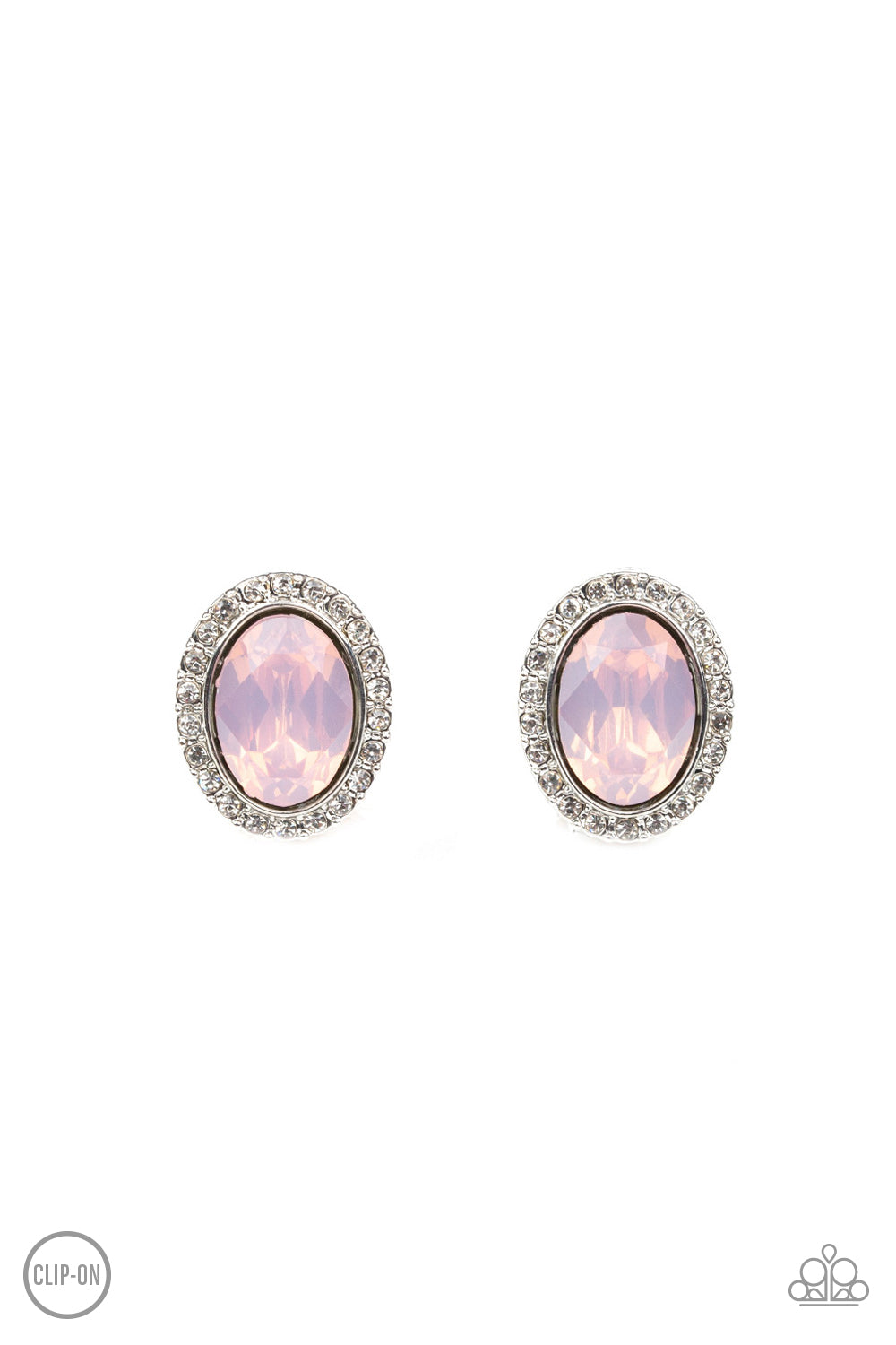 An opalescent pink gem is pressed into the center of a silver frame radiating with dainty white rhinestones for a refined flair. Earring attaches to a standard clip-on fitting.