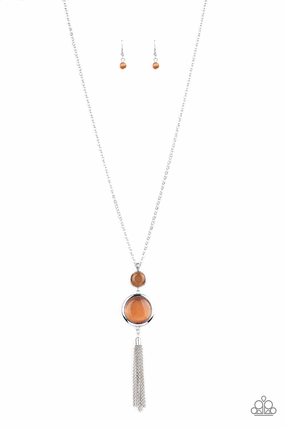 Swinging from the bottom of a glistening silver chain, glowing stacked moonstone pendants give way to a shimmery silver tassel for a refined look. Features an adjustable clasp closure. Sold as one individual necklace. Includes one pair of matching earrings.