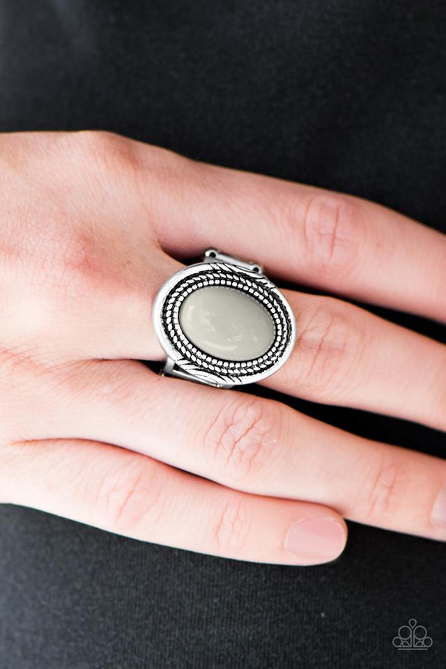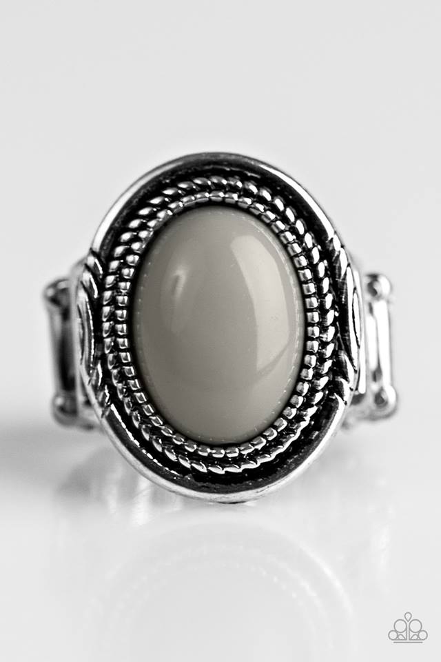 A Neutral Gray bead is pressed into the center of a shimmery silver frame radiating with texture. Features a stretchy band for a flexible fit.
