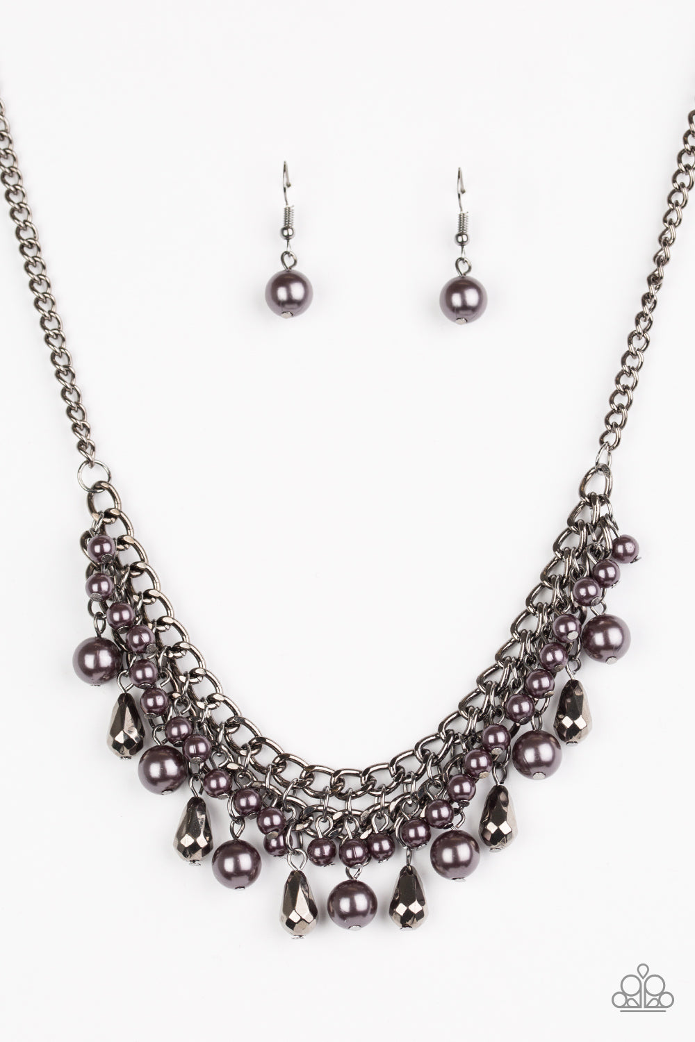 Varying in size, pearly gunmetal beads and faceted gunmetal teardrops drip from the bottoms of interlocking gunmetal chains, creating a bold industrial fringe below the collar. Features an adjustable clasp closure.