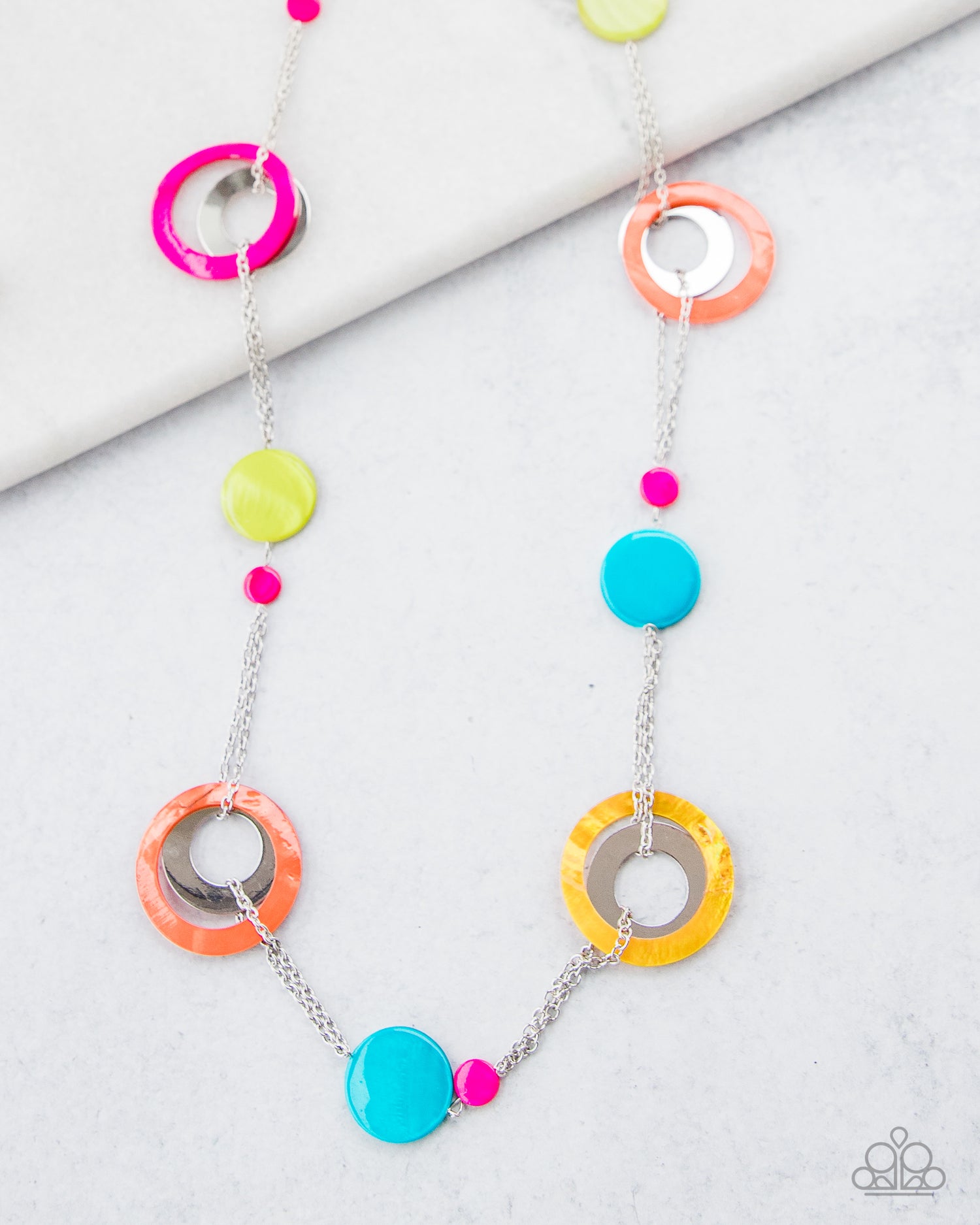 Chunky brightly-colored rings and discs with swirly marble finishes join thick metal hoops to climb a simple silver chain and create a retro-inspired feel. Features an adjustable clasp closure.
