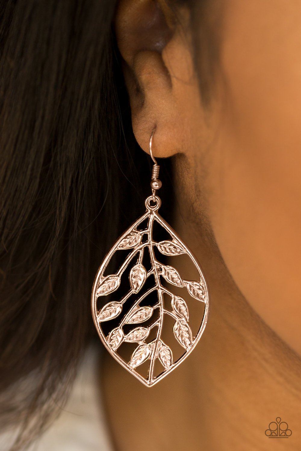 Leafy rose gold bars vine out across a leaf-shaped frame, creating a whimsical lure. Earring attaches to a standard fishhook fitting.
