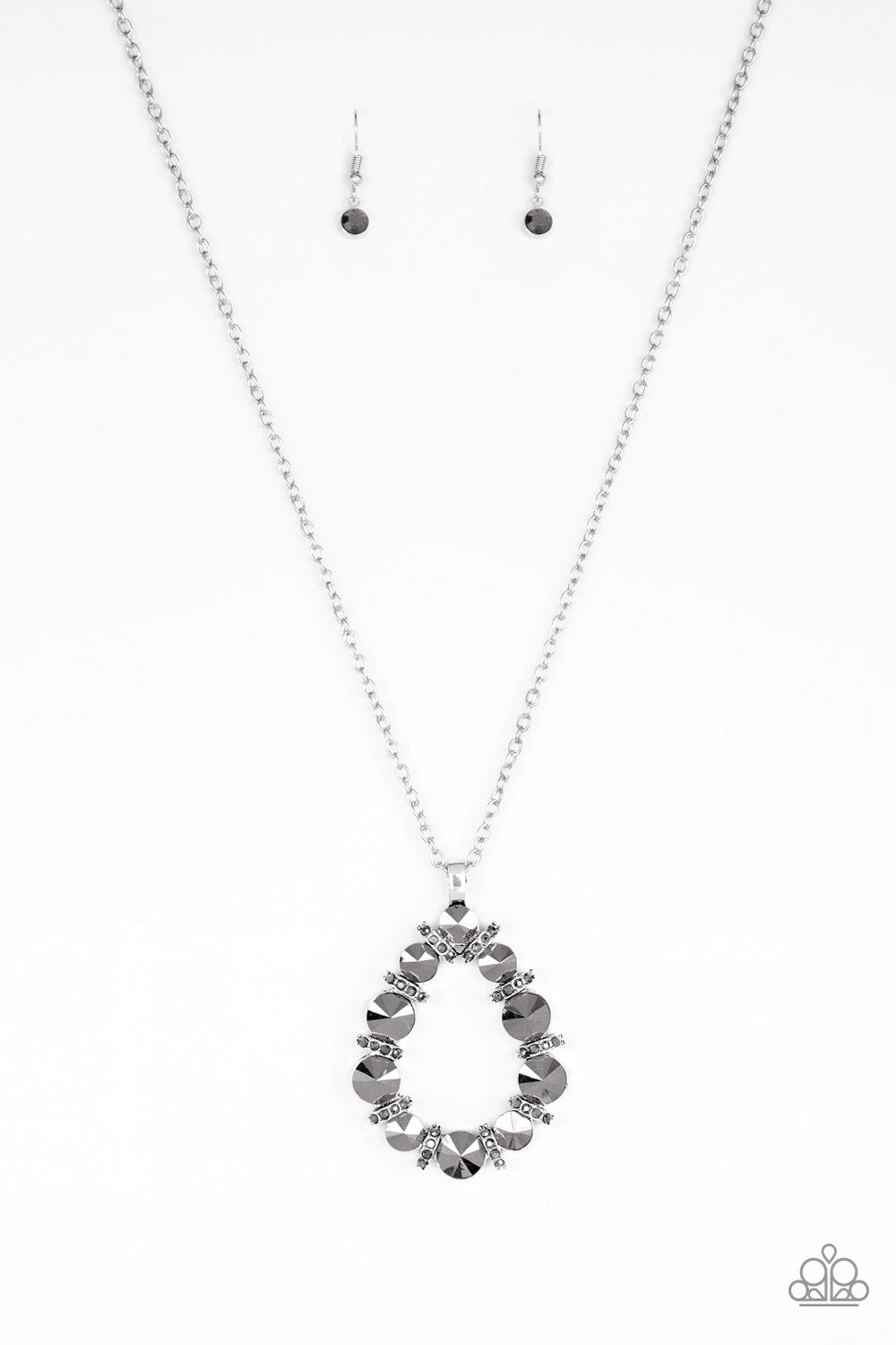 Smoky rhinestone encrusted silver rings connect with oversized hematite gems, coalescing into a dramatic pendant. The glittery teardrop pendant swings from the bottom of a lengthened silver chain in a glamorous fashion. Features an adjustable clasp closure.