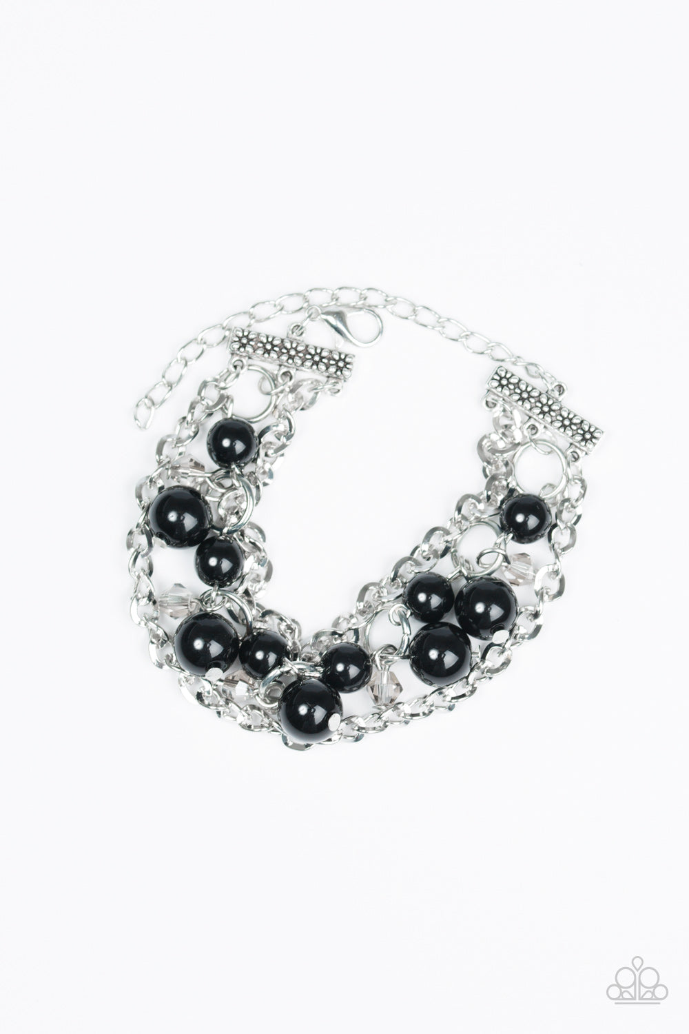Attached to two floral fittings, rows of shimmery silver chains flank a black beaded strand around the wrist. Dramatic black beads and faceted crystal-like beads swing from the centermost strand for a refined finish. Features an adjustable clasp closure.