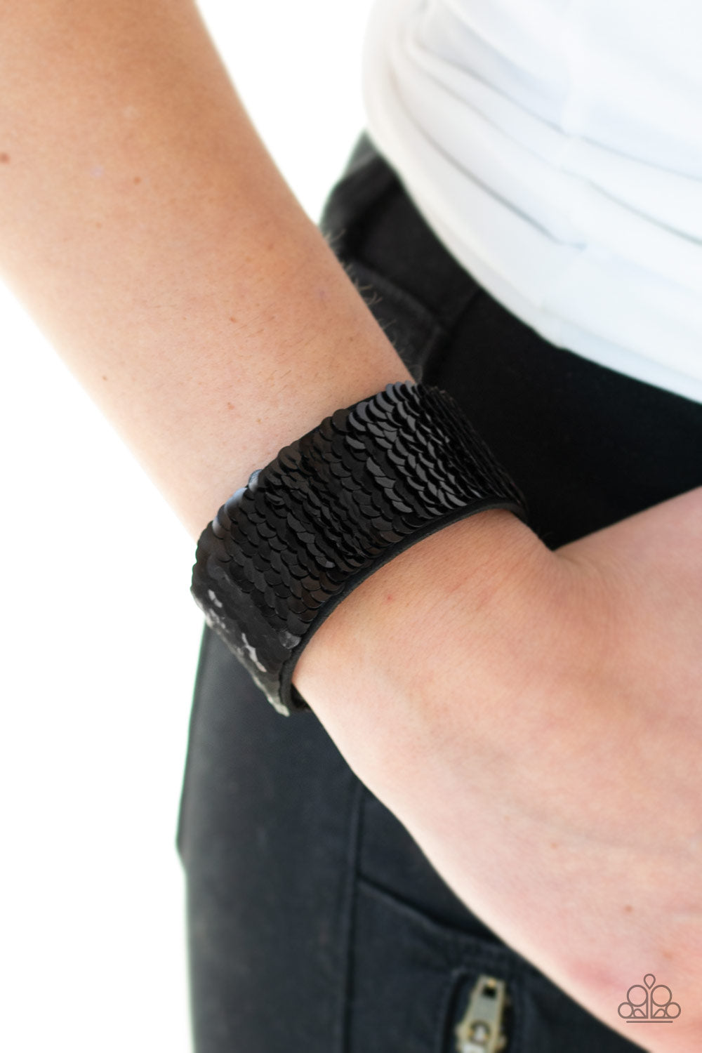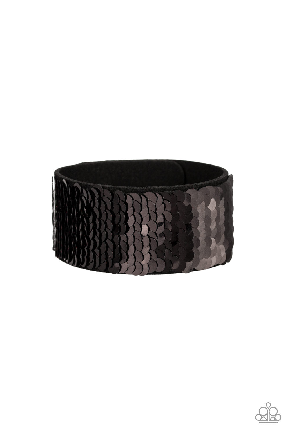 Row after row of shimmery sequins are stitched across the front of a black suede band. Bracelet features reversible sequins that change from black to red. Features an adjustable snap closure.