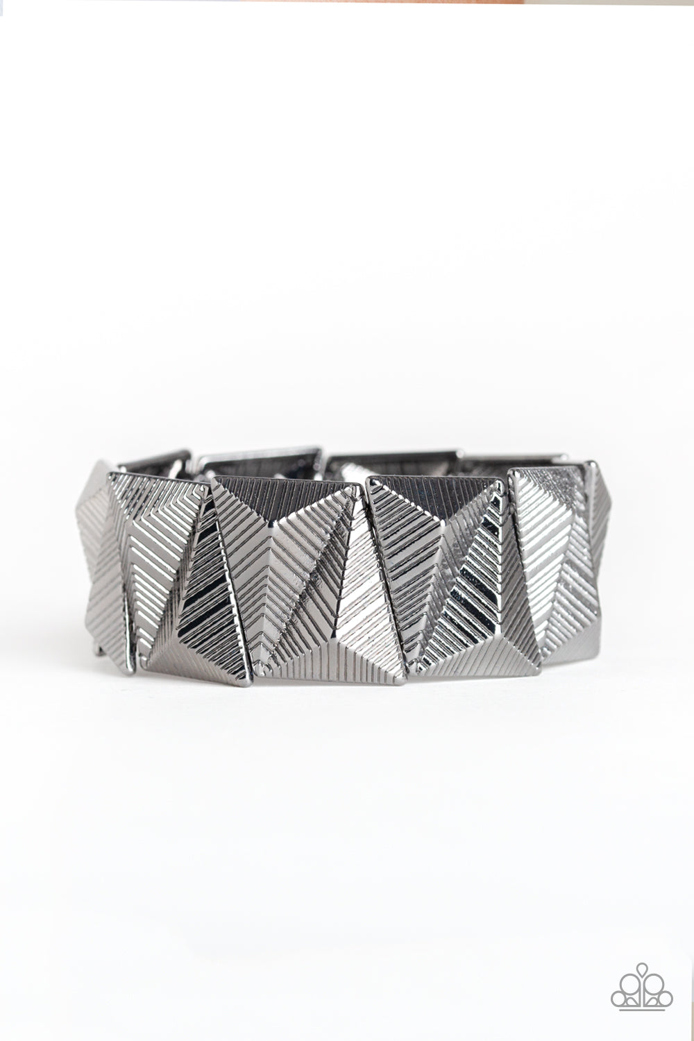 Etched in linear textures, triangular gunmetal frames are threaded along stretchy bands around the wrist for an edgy look.