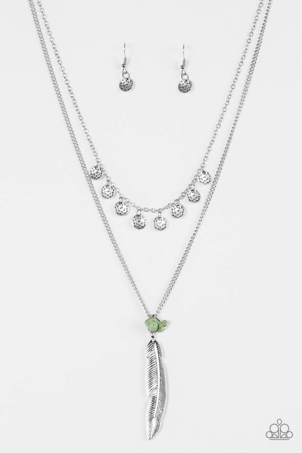 Delicately etched in shimmer, dainty silver discs swing from the uppermost chain above a silver feather pendant. Refreshing green rocks swing alongside the whimsical feather, adding an earthy finish to the wanderlust palette. Features an adjustable clasp closure.