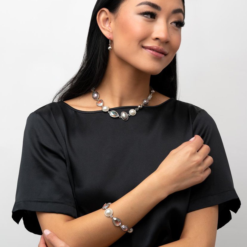 A collection of classic white pearls, iridescent pearly silver beads, white emerald cut gems, and iridescent crystal-like teardrops dance below the collar for an ethereal display. Shiny silver frames encase each bead, adding a romantic vibe to the vintage inspired design. Features an adjustable clasp closure.