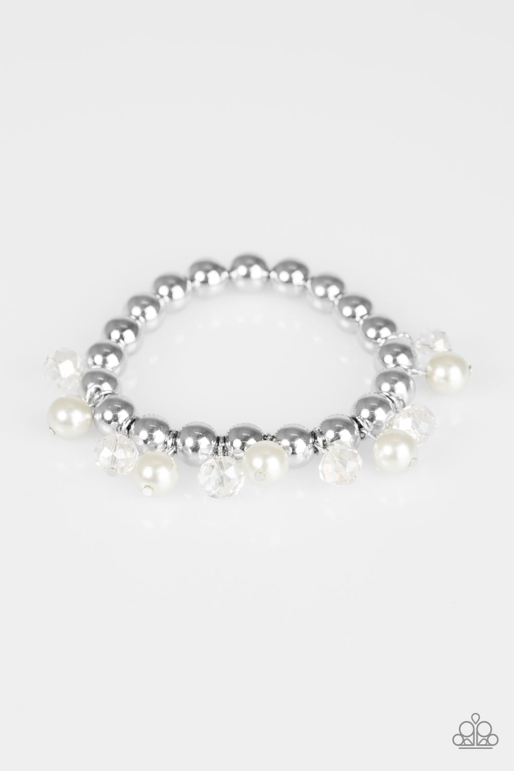 Shiny silver beads are threaded along an elastic stretchy band. Classic white pearls and glassy crystal-like beads swing from the wrist for a refined look.