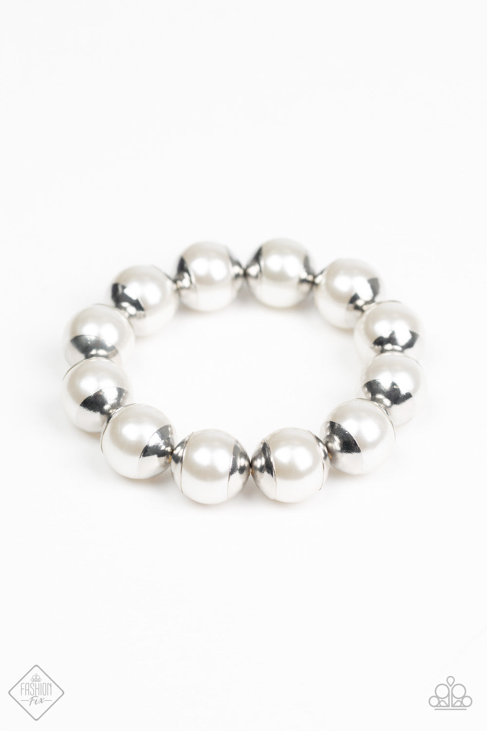 Capped in vintage silver accents, oversized white pearls are threaded along a stretchy band in a timeless finish.