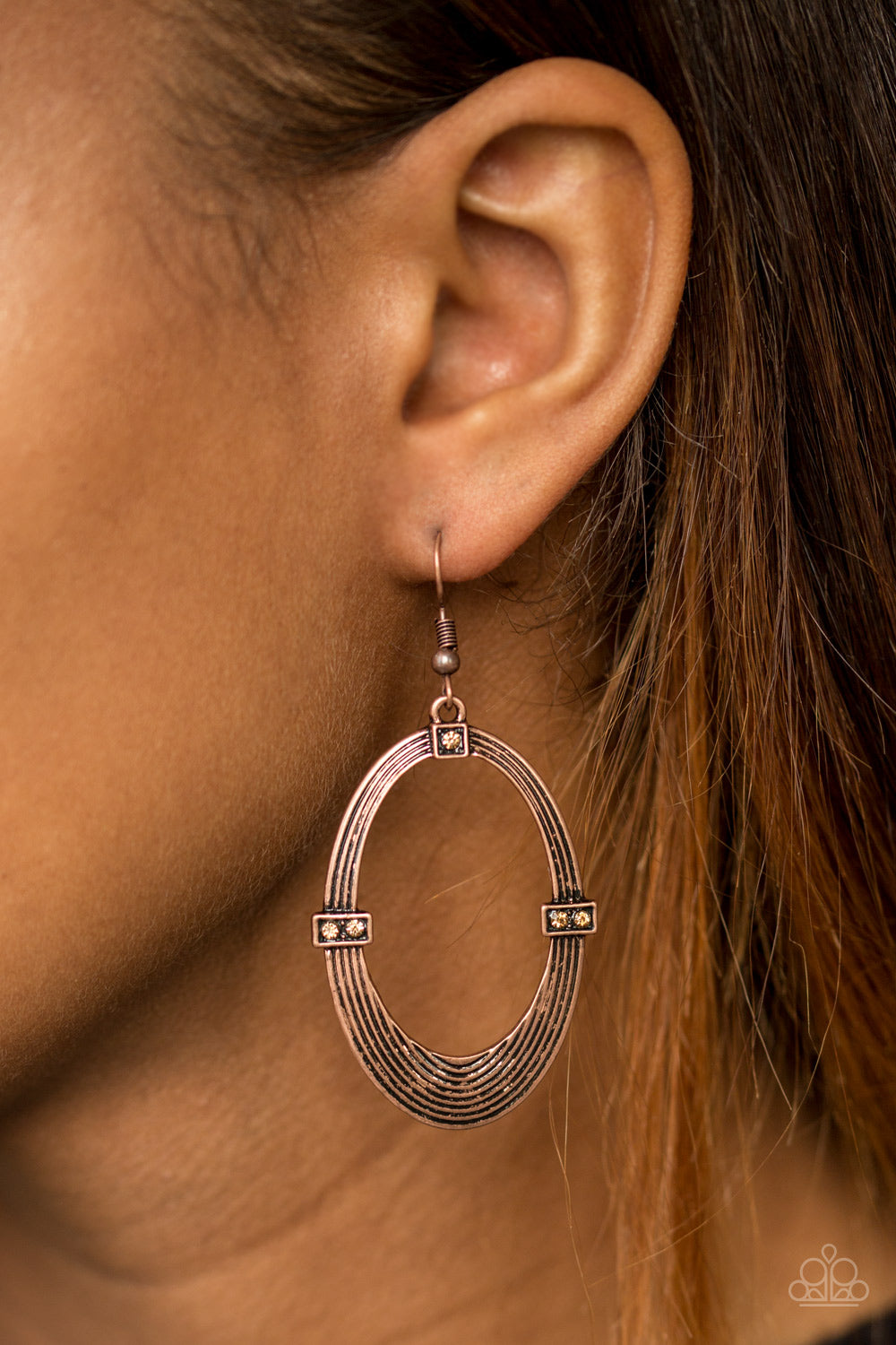 Etched in circular textures, a shimmery copper oval is encrusted in dainty topaz frames for an edgy look. Earring attaches to a standard fishhook fitting.