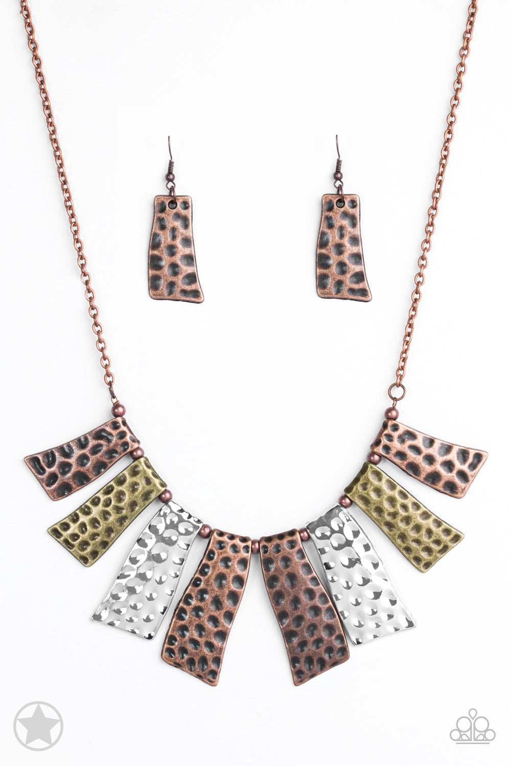 Abstract wavy plates of copper, silver, and brass are texturized with eye-catching hammered divots and alternating copper beads along a copper chain. Features an adjustable clasp closure.