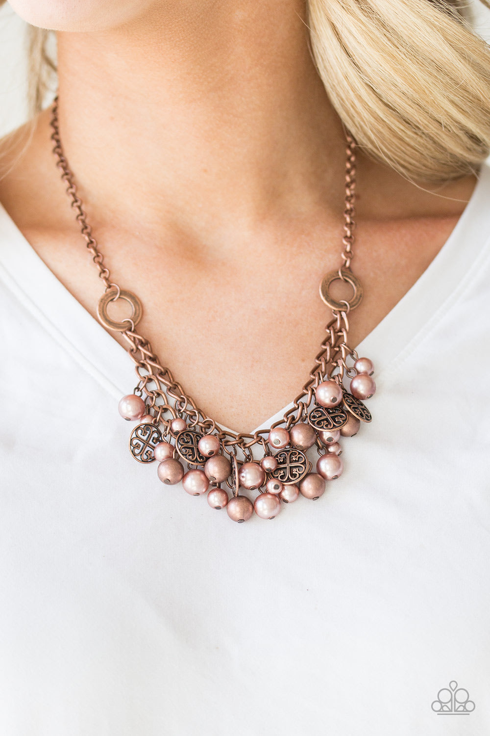 Coppery pearls, copper beads, and shimmery copper accents swing from the bottom of interlocking copper chains, creating a bold fringe below the collar for a glamorous look. Features an adjustable clasp closure.