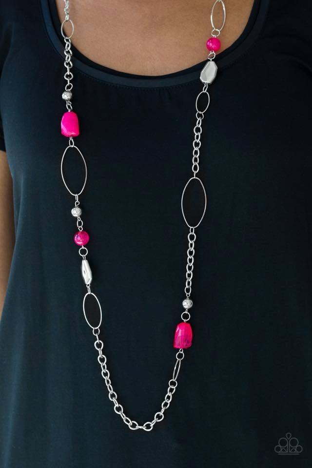 Featuring round and faceted shapes, vivacious pink and shiny silver beads trickle along a bold silver chain for a seasonal look. Features an adjustable clasp closure.