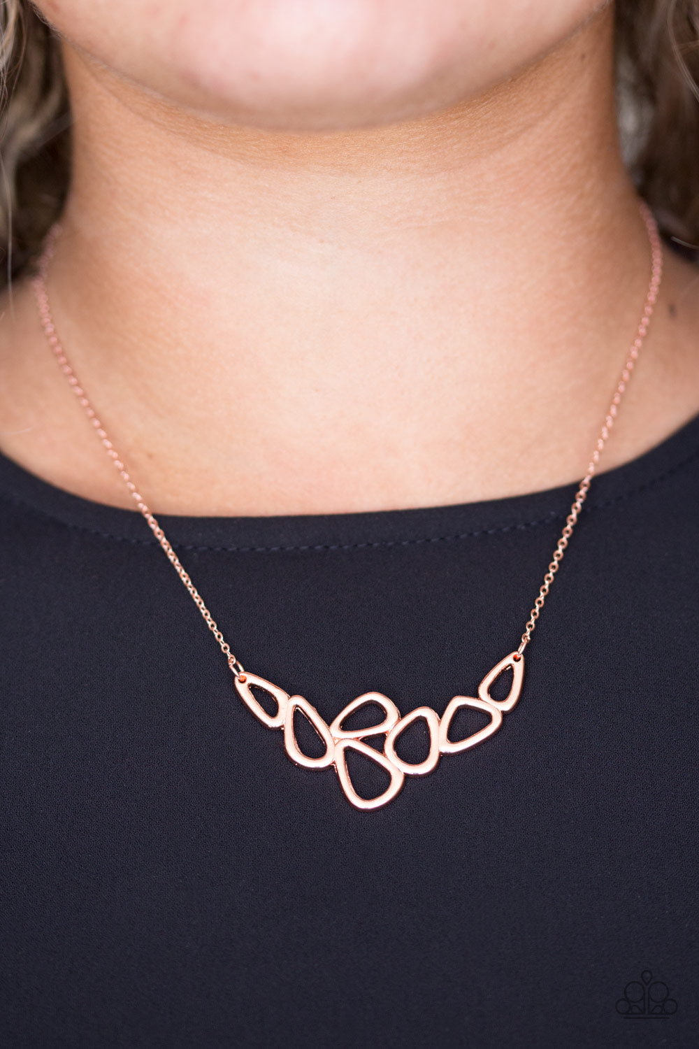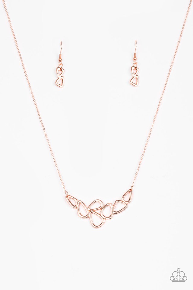 Asymmetrical shiny copper accents coalesce into an airy pendant below the collar. The simple tone on tone palette creates a casual piece with hints of undeniable industrial undertones. Features an adjustable clasp closure.