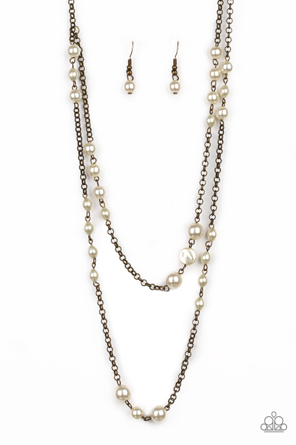 Varying in size and shape, pearly beads trickle along two brass chains, creating refined layers across the chest. Features an adjustable clasp closure.