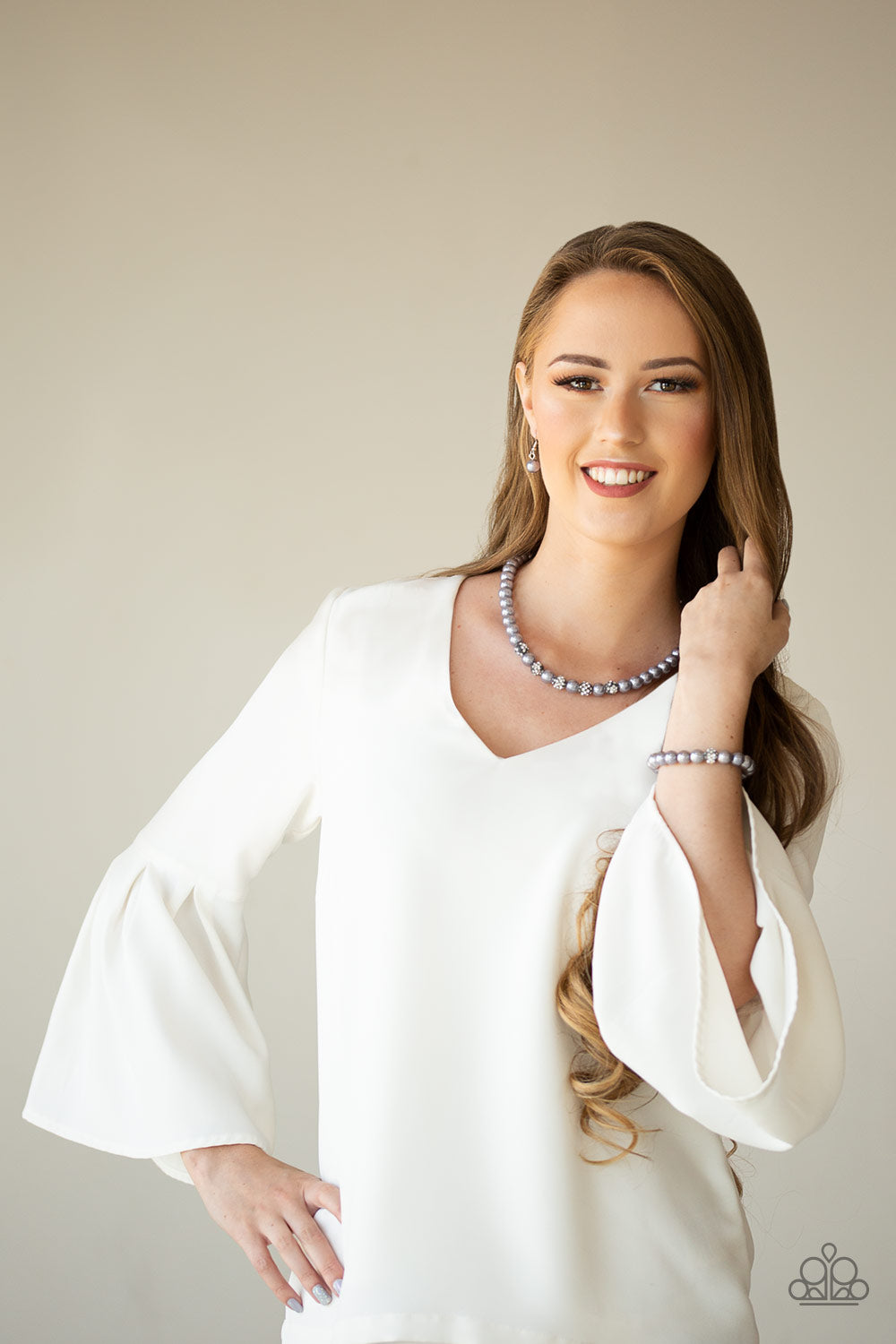 Infused with glittery rhinestone encrusted beads, a classic strand of silver pearls drapes below the collar in a timeless fashion. Features an adjustable clasp closure.
