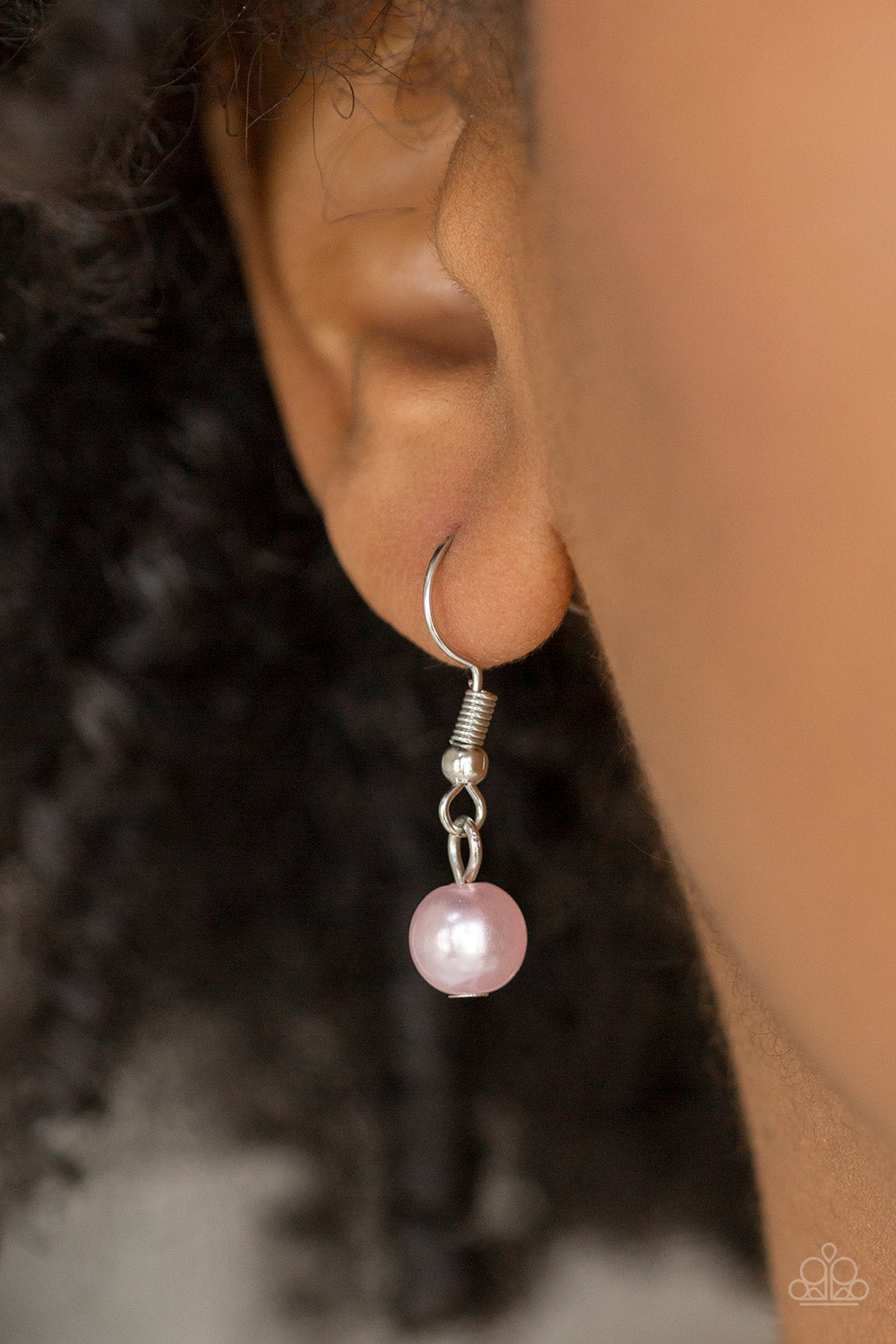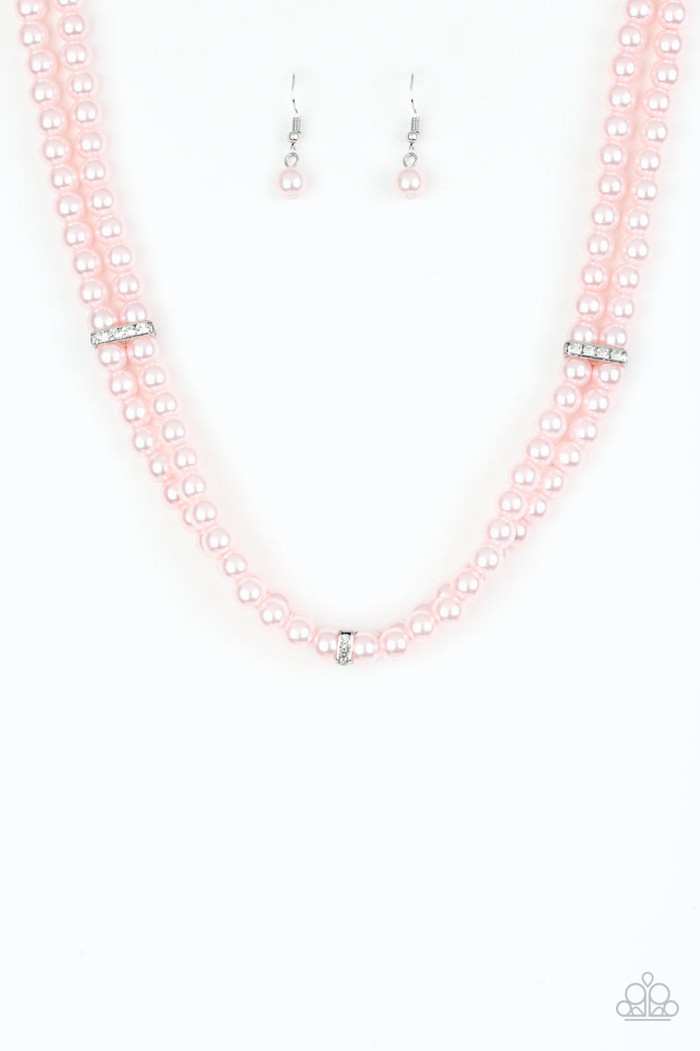 Pinched between white rhinestone encrusted frames, strands of classic pink pearls layer below the collar for a timeless look. Features an adjustable clasp closure.