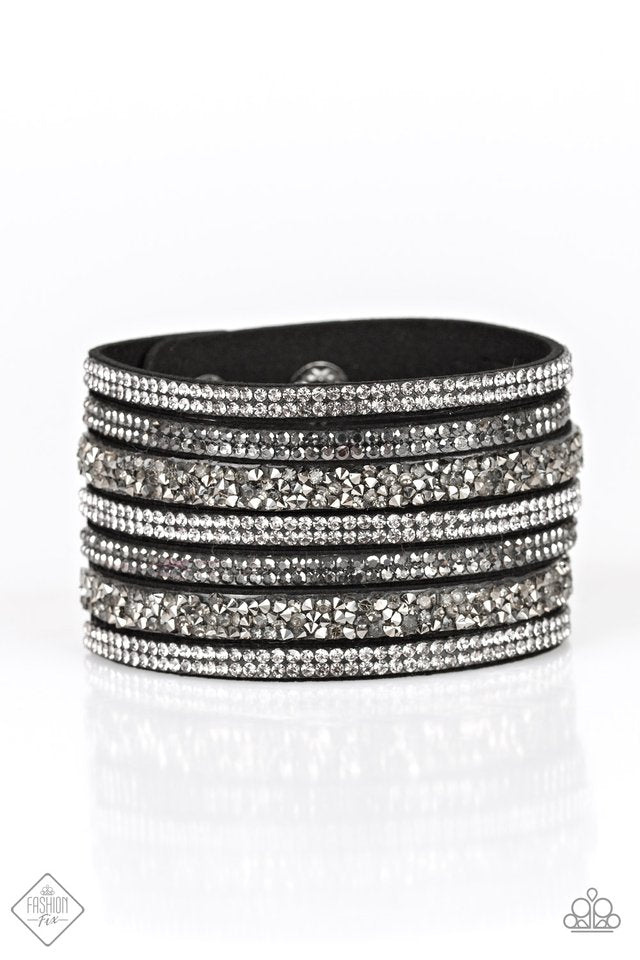 Featuring classic round and edgy prism style cuts, row after row of smoky and hematite rhinestones stack across the wrist for a sassy look. Features an adjustable snap closure.