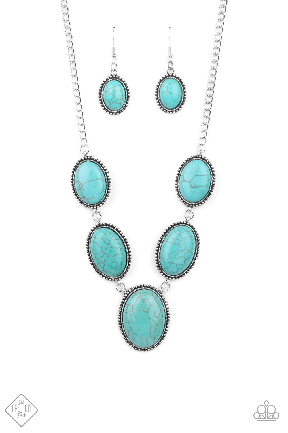 (P2SE-BLXX-434WJ)- Bordered in rustic silver studded frames, an earthy collection of oversized turquoise stones boldly links below the collar, creating a timeless Southwestern staple. Features an adjustable clasp closure.