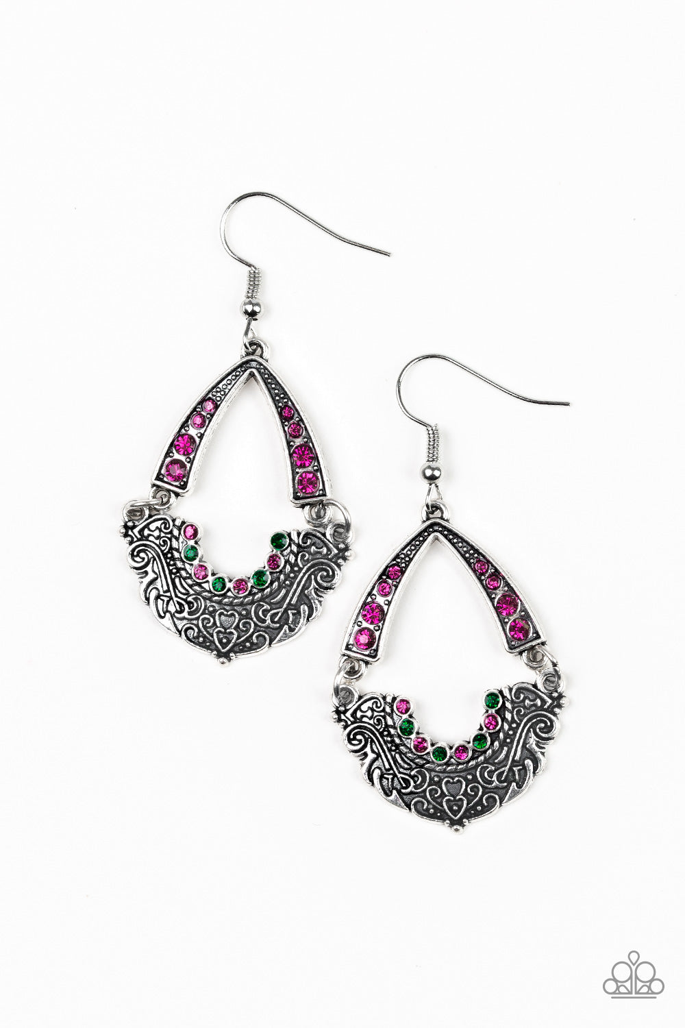 Encrusted in dazzling green and pink rhinestones, an arcing silver frame links with an ornate silver frame radiating with filigree filled details for a refined look. Earring attaches to a standard fishhook fitting.