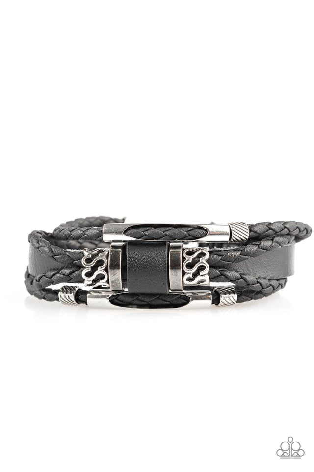 Mismatched metal accents are threaded along braided leather cording and a classic black leather band for an edgy urban look. Features an adjustable sliding knot closure.