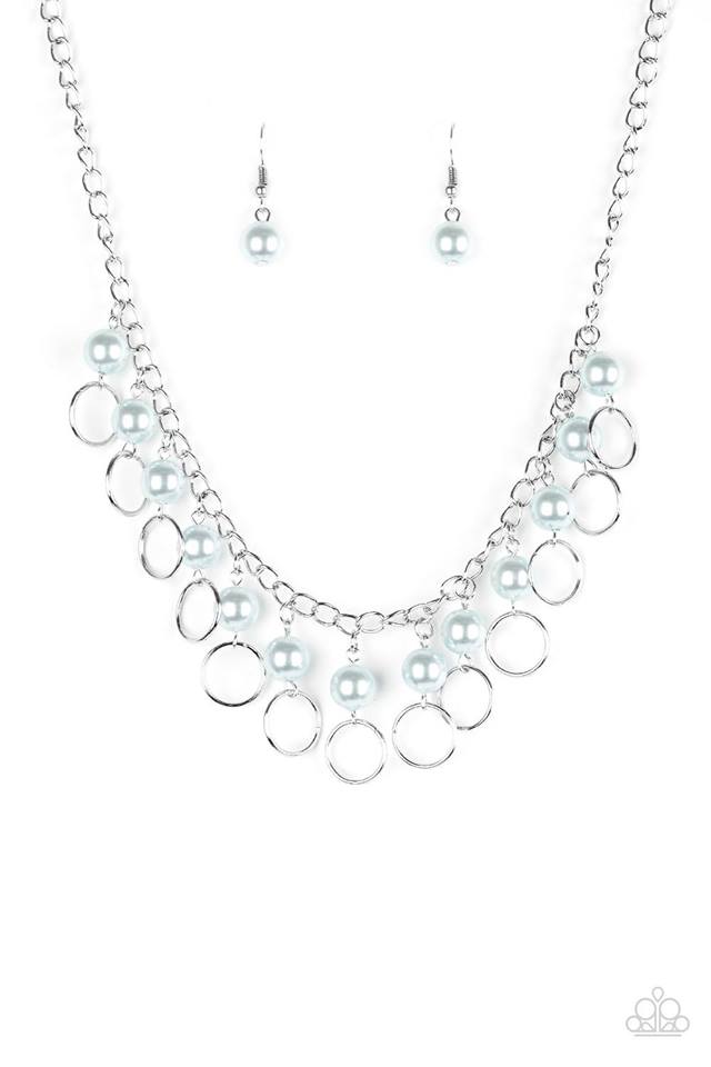 Classic blue pearls trickle from the bottom of a glistening silver chain. Shimmery silver hoops cascade from the pearls, creating a flirty fringe below the collar. Features an adjustable clasp closure.
