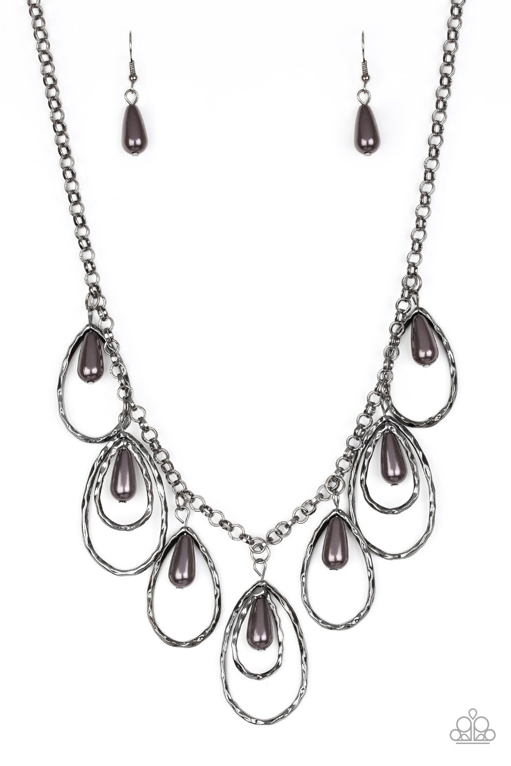 Pearly gunmetal teardrop beads swing from the tops of delicately hammered gunmetal teardrop frames, creating a refined fringe below the collar. Features an adjustable clasp closure.