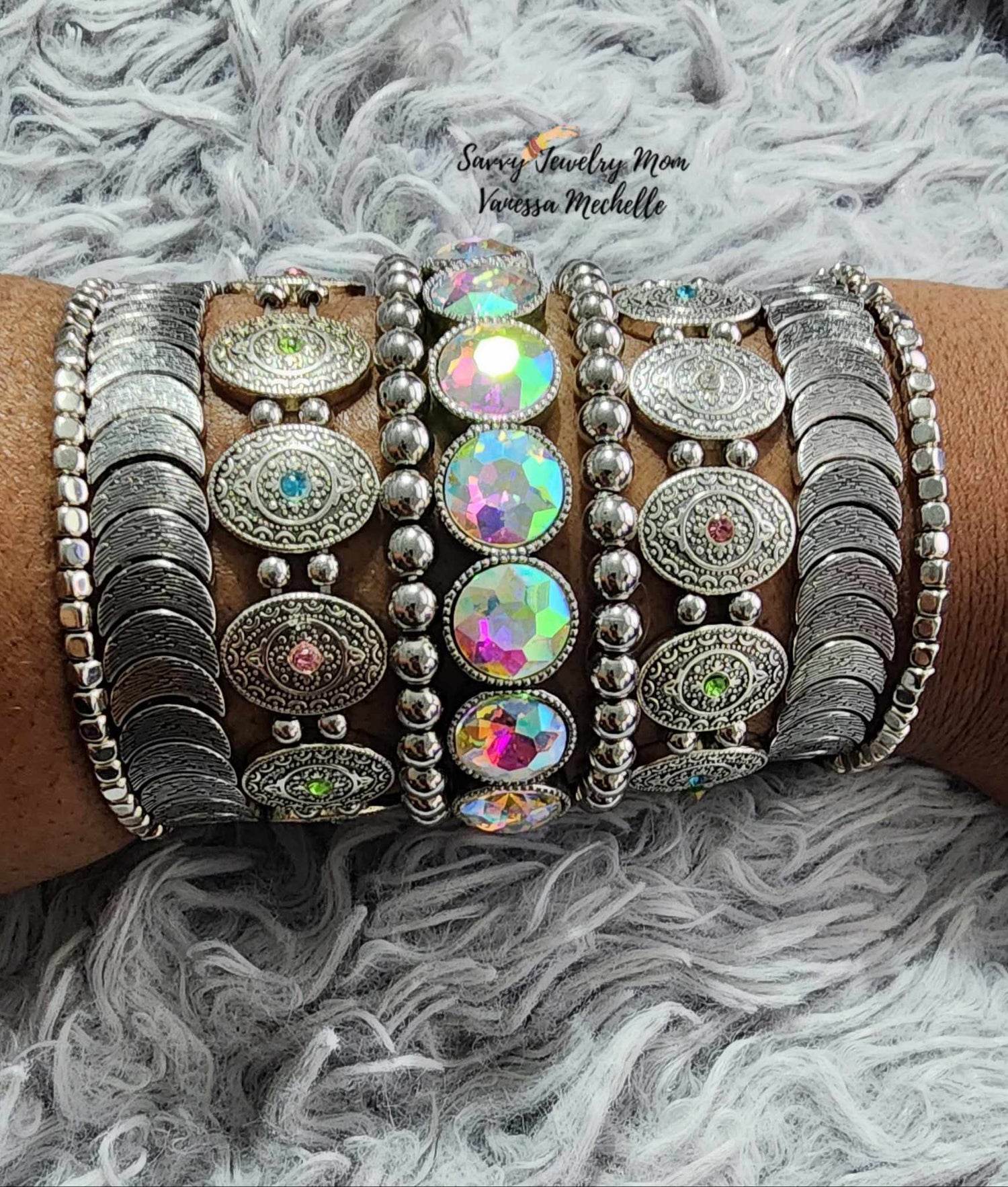 This is a 5 piece Multicolor/Silver Savvy Wrist Swag
