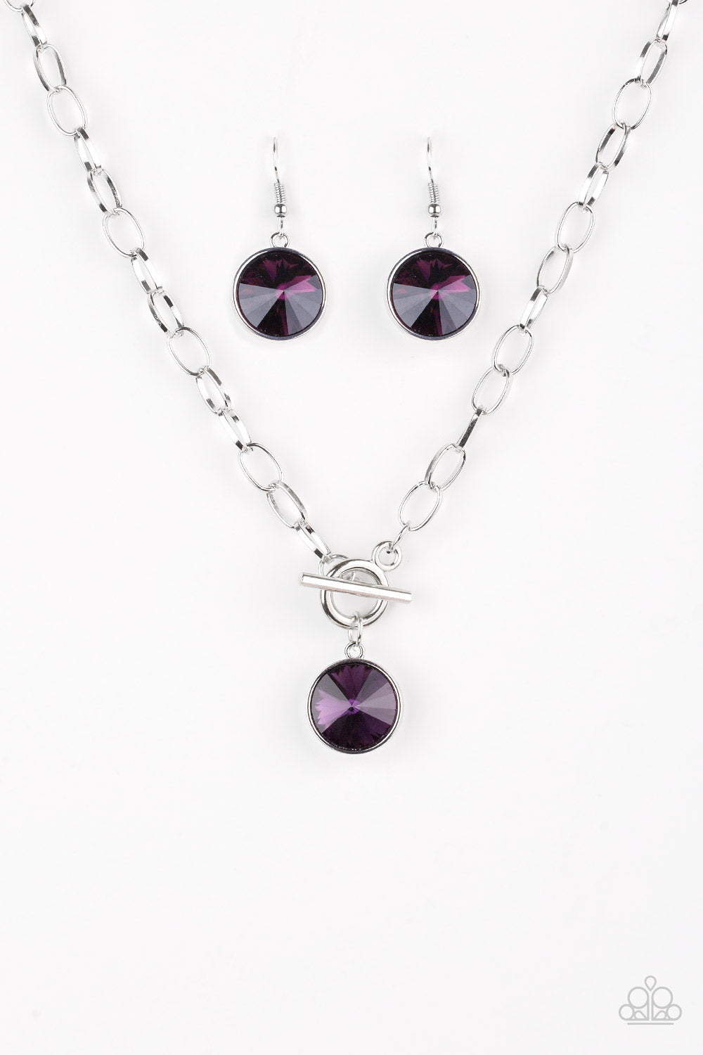 A dramatic purple gem swings from the bottom of a shiny silver chain, creating a blinding pendant below the collar. Features a toggle closure.