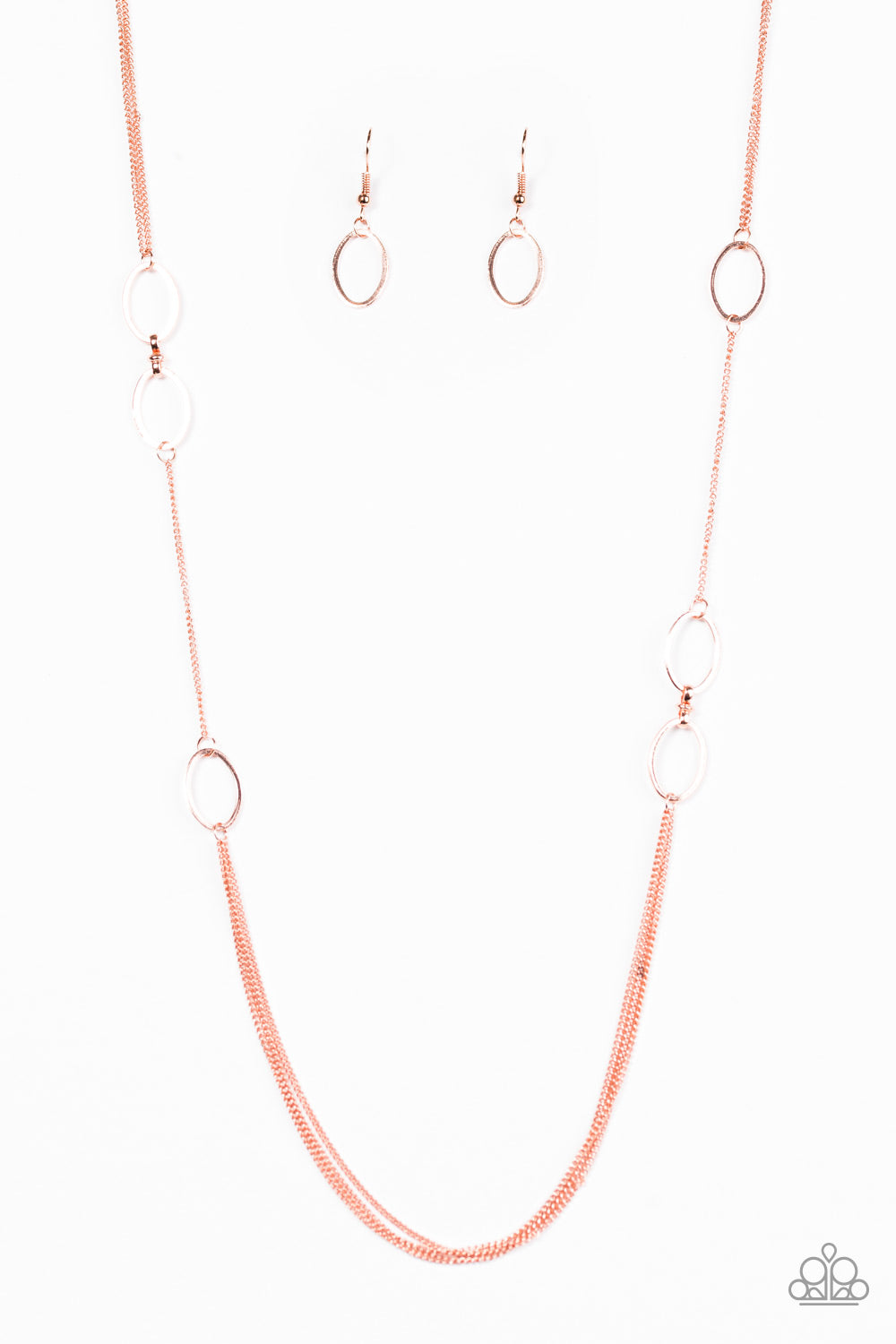 Dainty shiny copper hoops trickle along shimmery copper chains, creating a gorgeous tone on tone palette for a refined look. Features an adjustable clasp closure.