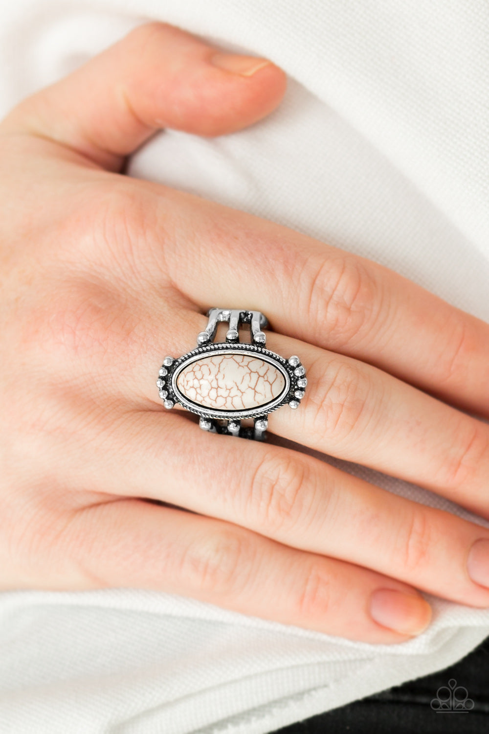 Chiseled into a tranquil oval, a smooth white stone is pressed into a pronged frame for a seasonal look. Features a stretchy band for a flexible fit.